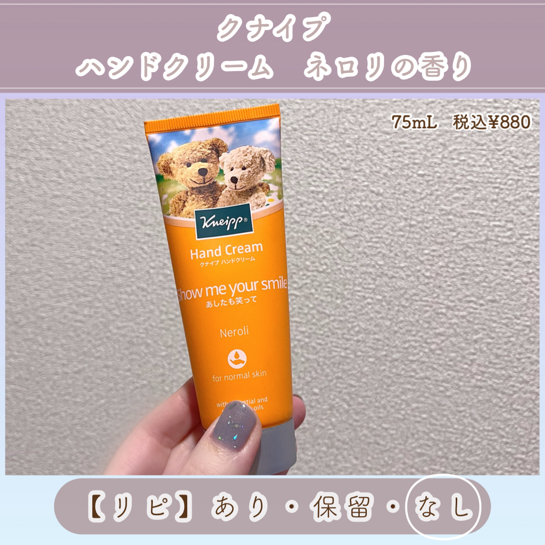 #LIPS購入品#ハンドケアクナイプハンドクリームネロリの香り75ml1000円位で購入香りは一瞬強く出て、その後は弱い香りが続く伸びが良くてベタつかない少量でしっかりケアできるネロリの香りが好きな方にオススメこれはリピートするつもりコスパが...