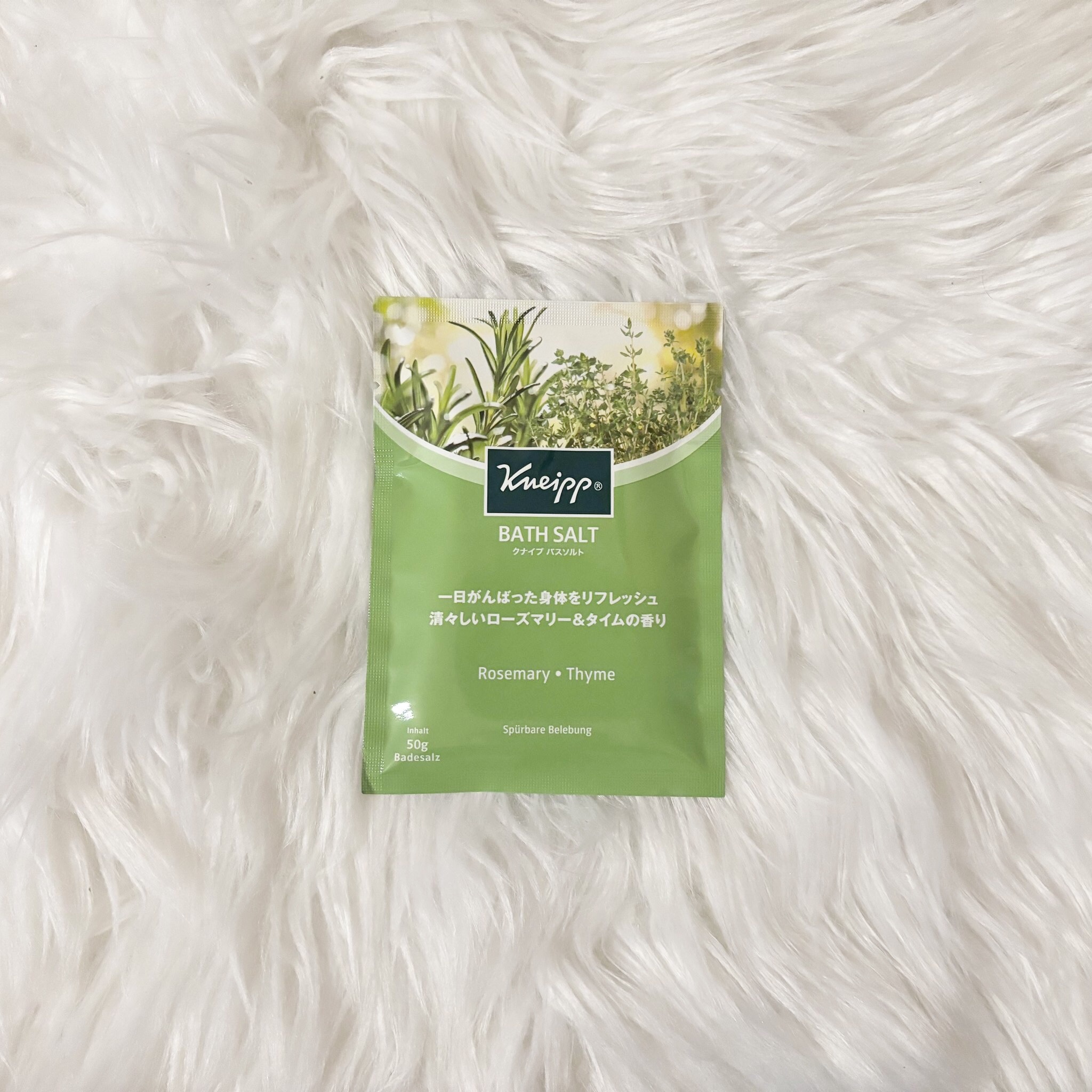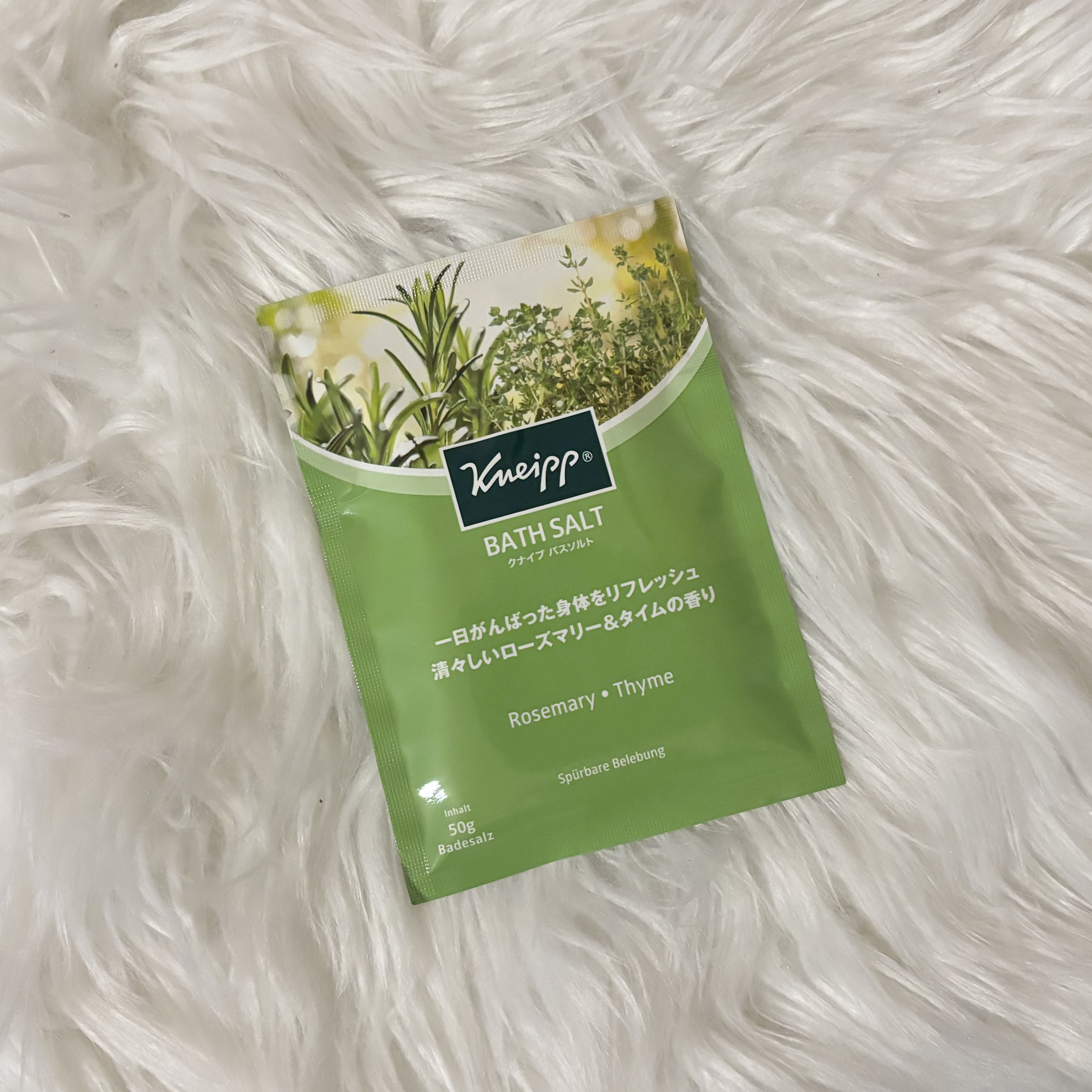 ●KNEIPPクナイプ バスソルト ローズマリー&タイムの香り50g ¥176(税込)がんばった一日の終わりにリフレッシュバスタイム古代海水から精製したミネラル豊富な天然岩塩 +ローズマリーとタイムから抽出した天然植物成分を配合透明感あふれるグリーンのお湯パッケージがリニューアルされて個包装タイプはちょっと値上がりしてます。850g/税込2,640円はお値段そのまま。クナイプのバスソルトはリラックス系のものばかり使ってきたので、スッキリ系のものを使うのは初めてかも。バスソルトをお風呂に流し入れた途端、目の覚めるような爽快感のある香りが。お湯の色はほんのり淡い緑です。運動後に入浴。疲れきっていましたが、すっきりした香りに包まれて心身ともにリフレッシュできた感じがしました。冷たい体をぽかぽか温めるというより疲れをリセットしてくれるので、春~秋の初めに使いたいような入浴剤。