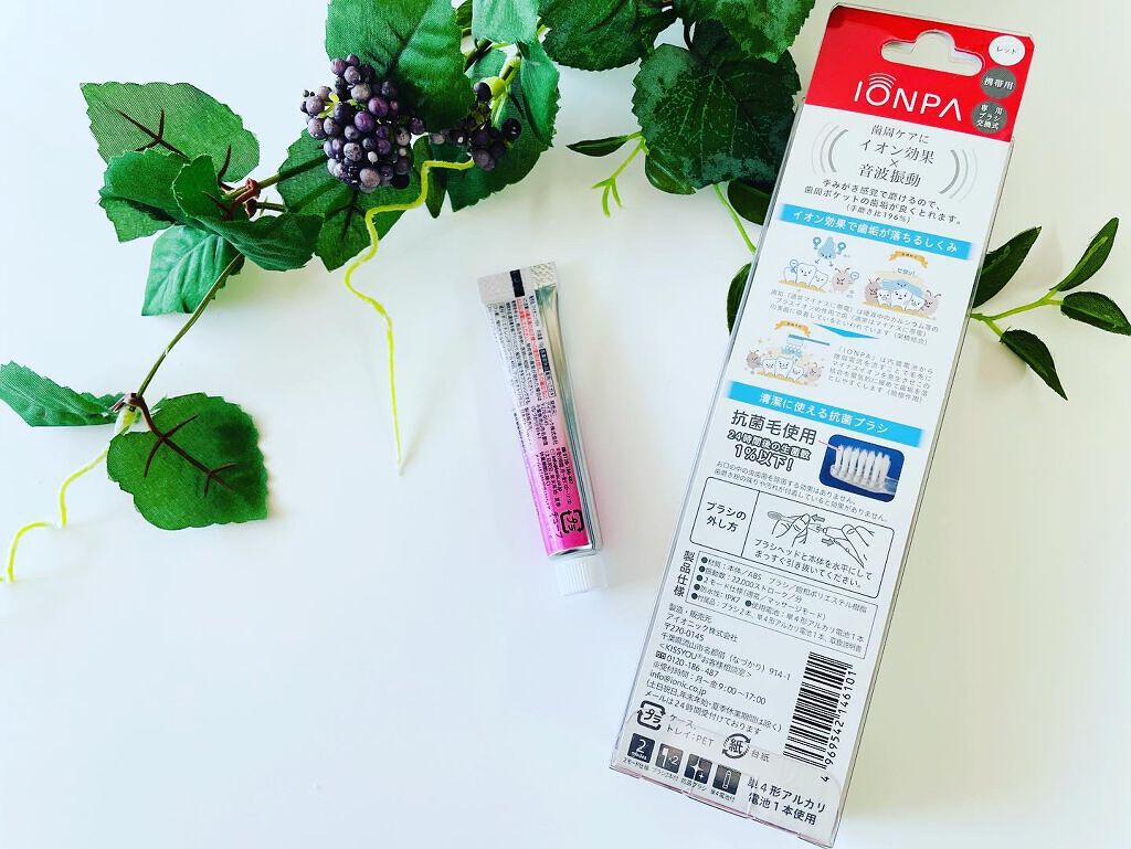 【音波振動歯ブラシIONPA】のご紹介です。『商品説明』和泉雄一教授(東京医科歯科大学歯学部附属病院)と歯周病予防に最適な電動歯ブラシを開発。マイナスイオンのこびりついた歯垢を落とす力と音波振動の汚れを除去する力で歯周病を予防します。◇どこでも使える携帯用イオン効果があるから水だけでも磨けて、ランチの後や旅先でもツルツルとした清潔な歯に。◇抗菌毛を使用した歯ブラシキャップを閉めても嫌なニオイが発生しにくく、清潔な状態をキープします。◇「クリーン」と「ガムケア」の2つのモードを搭載。◎クリーンモード毎分約22,000ストローで振動する、通常の歯みがきに用いるモード。手磨きと同じように磨くことができ、歯垢をスッキリ落とします。◎ガムケアモード1秒間に1回瞬間的に振動を止め、歯ぐきに心地よい刺激を与えてマッサージするためのモード。イオンの力も加わり歯周ケアにも効果的です。◎ブラッシング時間タイマー機能30秒毎に1回停止した後、再び動き出し、2分後に2回停止するという動作を繰り返し行う機能。各歯をそれぞれどれ位磨いたか、ブラッシング時間の目安をお知らせします。☆______☆______☆______☆______☆とてもスタイリッシュでおしゃれな電動歯ブラシになります。今回はたくさんのカラーバリエーションの中からレッドをお試しさせて頂きました。こちらはクリーンモードとガムケアモードの2つが搭載されておりそれぞれを使い分けしてまら口腔ケアすることができます。どうしても手で磨いたときには磨き残しが出て来てしまいますが電動歯ブラシだとしっかりと電動して動いてくれる分しっかりと奥歯や歯と歯の間まで磨けている感じがします。わたしは元々ダラダラと長く歯磨きをしてしまうタイプなのですがこちらはタイマーがついているので今どれくらい歯磨きをしたのかがわかりやすくて助かります。携帯要なので旅行の時や仕事の時にもっていけてとても嬉しいです見た目もシックでおしゃれに作られているのがありがたいです。こちらも歯ブラシ部分を付け替え可能なので長期的に使えるのが衛生的にもコスパ的にも嬉しいです。