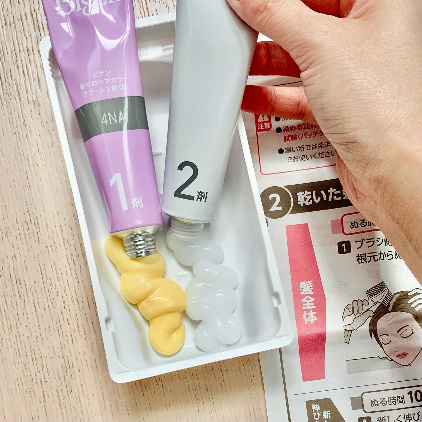 今回使ってみたのはこちら!「香りのヘアカラー」髪にぴったり密着して塗りやすいそうです。クリームタイプのヘアカラー!このシリーズ、カラー豊富で悩んじゃいますが、「4NA」ナチュラリーブラウンを使ってみました♫ビゲンのヘアカラーって、ドラッグストアで手に入りやすくて、お手頃価格なのが嬉しいんですよね😁箱から出してみると、ビニール手袋と櫛、クリームを混ぜるためのプラトレーが最初から入っているので、これ一箱で揃えなきゃいけないアイテムがしっかりと揃っているところが便利。髪染めよ!って思ったら美容室の予約なしで自宅で染めれるところがgood!使い方は、1剤(黄色っぽいカスタード色のクリーム)と2剤(少し透明感もある白っぽいクリーム)を混ぜます。クリームタイプなので液だれしにくくて、塗りやすさもばっちり☺️あと、使ってみて一番驚いたのが香り!ツンとしたにおいが少なくて、むしろフローラルっぽい優しい香りがふんわり💕カラー剤独特のにおいが苦手な私でも使いやすかったです🌷使用する前と使用した後の写真を撮ったのですが、私の感想ですが、染まり具合に満足しています😊私の印象では、色味に少し赤みを感じるようなブラウンで、個人的には好みの仕上がりでした🌼※仕上がりや色味の出方は髪質や元の色によって個人差があると思うので、気になる方はパッチテストと事前チェックを忘れずに!おうちカラー初心者さんにも使いやすい一本だと思います🫶#PR#白髪染め#ビゲン香りのヘアカラー#セルフカラー#おうち美容#ヘアカラークリーム#使ってみた感想