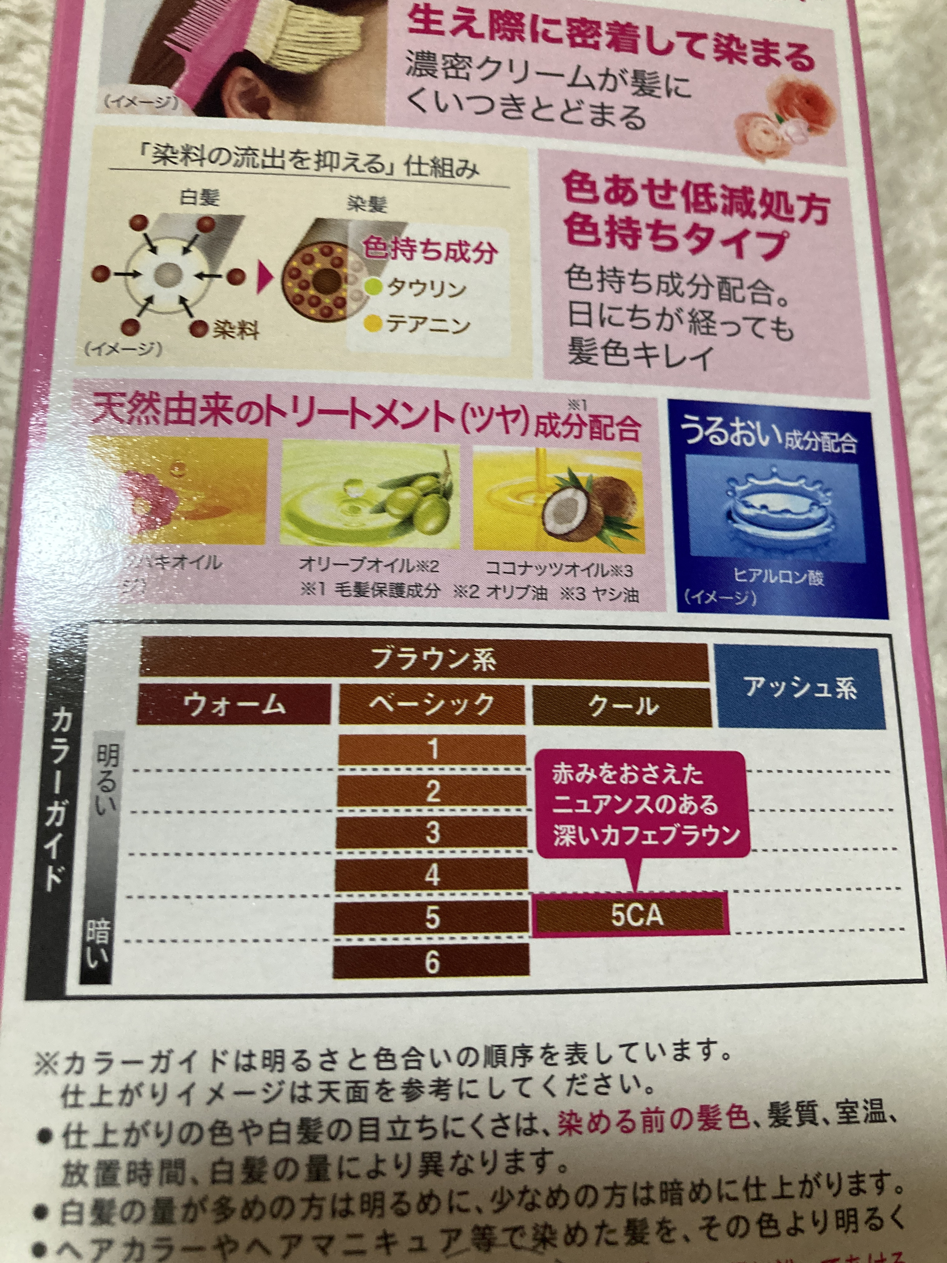香りのヘアカラー🩷特長①🩷☑️髪にぴったり密着するから、塗りやすい!しっかり染まる!☑️クリームタイプで生え際までしっかり染まるから、部分染めに便利!☑️生え際に、くいつきとどまる!💜特長2💜☑️ツンとしないフローラルのいい香り☑️染めた後もイヤなニオイが気にならない!💛特長3💛☑️染料が外に流出するのを抑えてくれるから、日にちがたっても髪色キレイ!☑️染めて日が経っても、白髪がキラキラ浮きにくく綺麗が続く使ってみた感想チューブから出しても嫌な匂いを感じませんでした!フローラル系の香りがして塗りやすいかなと思いました(❁´◡`❁)使い方も簡単で、2液を同量混ぜて丁寧に塗るだけ。部分カラーなのもポイントかも。色褪せ低減処方なのも嬉しいポイント。使わなかったチューブの中身(残り)は、次回にとっておけるということなので、エコで良いです(*/▽\*)5CAは、赤みをおさえたニュアンスのある深いカフェブラウンカラーです🤎