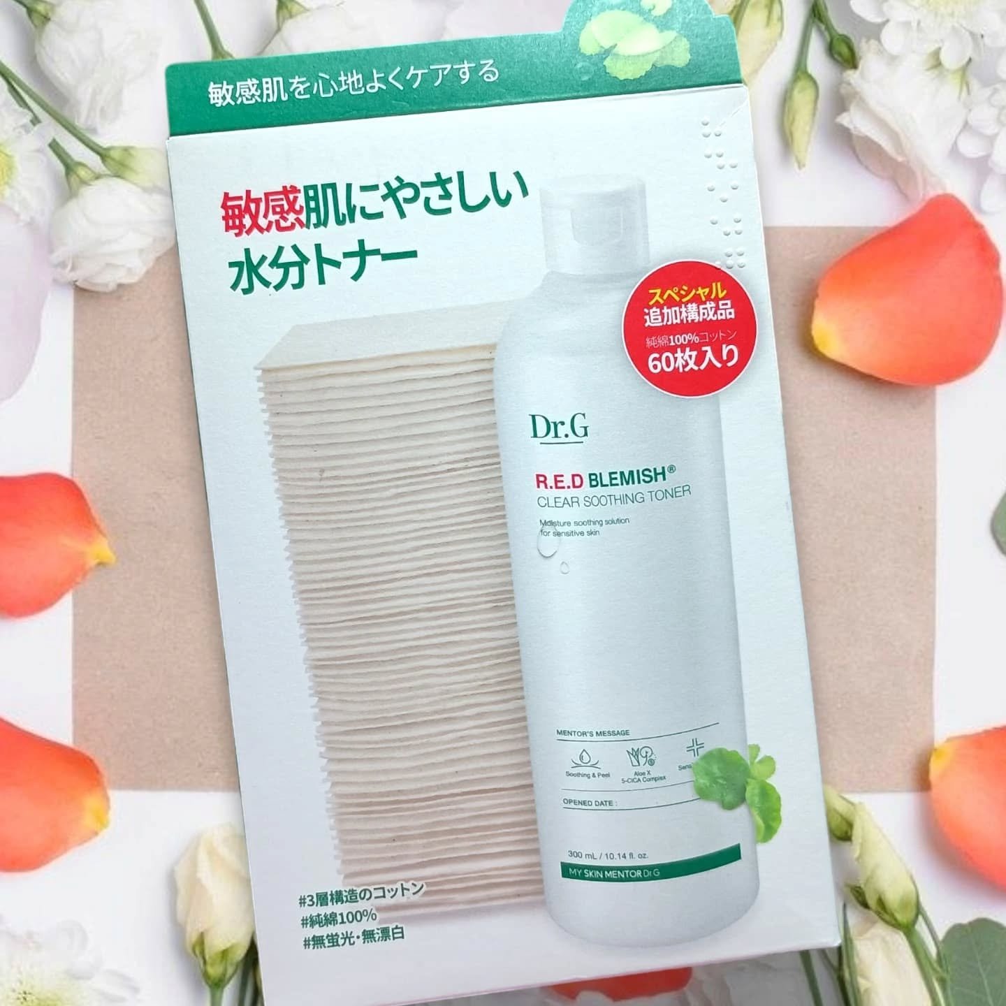 Dr.G様から、レビュー後のプレゼントでいただきましたありがとうございます敏感肌にやさしい水分トナー!〰️〰️〰️〰️〰️〰️〰️〰️〰️〰️Dr.G💚レッドプレミッシュクリアスージングトナー 300ml💚ナチュラルソフトタッチ三層コットン 60枚〰️〰️〰️〰️〰️〰️〰️〰️〰️〰️いろいろな使い方ができる3in1のトナーなんですしかも、コットン付き!🧡拭き取りとしてコットンにたっぷり浸して、クレンジングの残りと角質を除去して肌のキメを整える🧡水分補給として肌のコンディションに合わせて、必要なだけ2〜5回ほど重ね塗りして吸収させる🧡パックとしてコットンにたっぷり浸して、スキンパックとして活用熱が上がった肌の温度を下げてくれる😊私は、洗顔後に拭き取りとして使い、その後、数回重ね塗りして、肌に水分補給をしています使用感は、さっぱりとした使い心地でわずかにトロミ感があり、肌なじみが良いトナーです付属のコットンは、綿100%で無漂白・無蛍光!毛羽立つことなく、柔らかい肌触り!三層構造になっていて、トナーをたっぷり含ませると、簡単に3枚のコットンに分かれて、肌にペタペタ貼りやすくなっていますパックとして使うのも、水分で肌が潤いお気に入りですぜひチェックしてみてくださいね#PR#drg#ドクタージー#レッドブレミッシュ#レッドブレミッシュクリアスージングトナー#スージングトナー#化粧水#韓国スキンケア#韓国コスメ