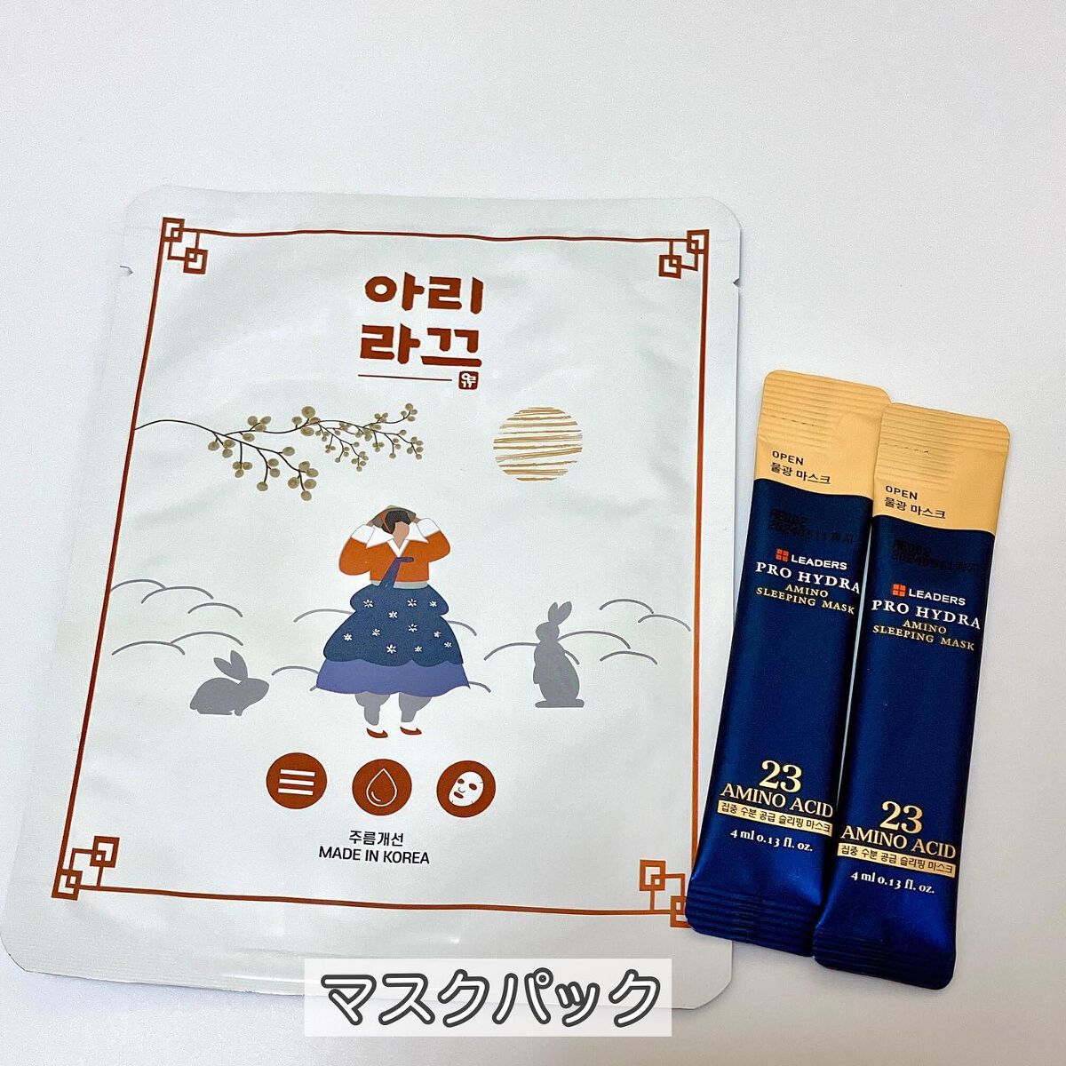 韓国コスメ現品3点以上、マスクパック1枚、スリーピングマスク2本など、合計5〜7の商品(7000〜11000円相当)が3500円で購入できます。 リップが入ってて嬉しかったです! 初めてのブランドに会えるのも福袋ならではですね。 泡タイプの洗顔料。 泡タイプ好きだからとても嬉しいです。 沈殿したピンクの粉を綿棒で取って、気になるところにつけます。 シート大きめ。 マットで落ちにくいリップです。 なめらかで伸ばしやすいエッセンス。 軽い感じのスリーピングマスク。