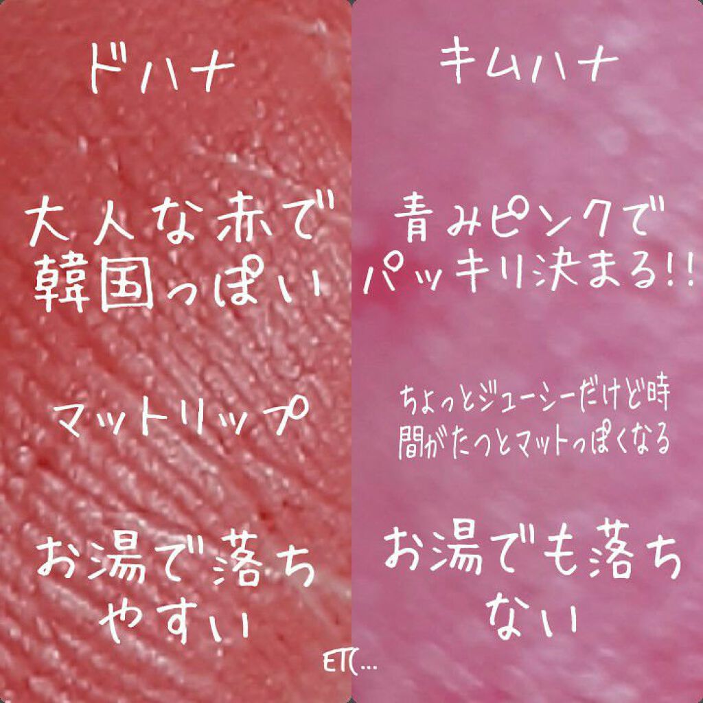 ღღMOART×A-TEENコラボリップ比較してみた!ღღ안녕하새요珠莉イムニダ🇰🇷明日テストだぁー😭まえ〜〜に、A-TEENのキムハナちゃんのリップを紹介しました!(サムネがA-TEENのやつです。見てみてください!)それで、ドハナちゃんのリップ、もし買ったら紹介すると言っていて、結構前に買ってたけど、紹介するの忘れてたので、します!キムハナちゃんとドハナちゃんの2つを比べながら紹介します!retugo-🍓🍓🍓🍓🍓🍓🍓🍓🍓🍓🍓🍓🍓🍓🍓🍓🍓🍓🍓🍓🍓🍓🍓🥛🍓🍓🍓🍓🍓ドハナちゃんのリップ→❤️キムハナちゃんのリップ→💜であらわします。❤️大人っぽ韓国赤🇰🇷💜Theピンク(ちょっとブルベ寄り?)❤️マットリップ💜最初ジューシー…時間が経つと…マット❤️お湯・クレンジングで落ちやすい!!💜全く落ちない❤️マスクやコップに付きやすい💜ちゃんとティッシュoffすれば❤️よりつかない❤️リップを塗ると発色めっちゃいい💜発色良すぎて怖いこのくらいかな?🍓🍓🍓🍓🍓🍓🍓🍓🍓🍓🍓🍓🍓🍓🍓🍓🍓🍓🍓🍓🍓🍓🍓🥛🍓🍓🍓🍓🍓値段は一緒だったと思います。(1600くらいかな?)キムハナちゃんの方は、(💜)発色強すぎるし本当にピンクなので、どこで使えばいいか分かりません笑ドハナちゃんのは、使いやすい色でお気に入りです!アンニョン(^^)/〜次回予告〜1週間足やせマッサージしてみた