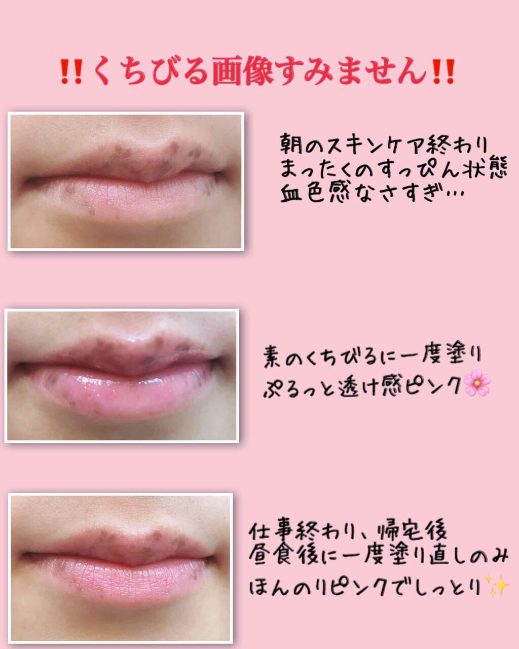 ‼️4枚めに唇の画像あります‼️苦手な方は見ないでくださいね。2020/08/29追記①選択した商品が間違っていたので訂正、カラーを追加しました。②チップで唇に直塗り&この夏の強烈な蒸し暑さのダブルパンチで劣化した?明らかに臭いが変わったし、今までに無かった違和感(ピリピリちくちく)があったので処分しました。可愛かったんだけどなー…チップ直付けのものはサッサと使い切らなきゃダメだな。ここから本文です↓↓ドンキでうっかり一目惚れ…久しぶりにコスメ衝動買いしてしまいました。数量限定とのこと、まだ残ってるかなぁ?もう無かったらすみません🙇♀️🙇♀️#Borica#リッププランパーエクストラセラムS¥1,800(税抜)プチプラというにはお高めやけど6.8gかな?結構たっぷり入ってる気がします。ボリカのプランパー、有名なのでよく耳にしていましたが今回初めて購入てみました。こちらサクラコレクションという事で102、103、104の3色並んでいました。選んだのは103番、細かいラメ入りで透け感のあるサクラピンクです。ちなみに102番はラメなしでクリーミーな青み寄りのピンク104番は、103番のラメ感透け感はそのままにイチゴっぽい赤みを足した感じでした。唇に血色感の無いわたしは正直104が欲しかったけど104だけ在庫なかったです。分かる、手の甲にテスター塗っただけで可愛かったもん…なんで限定品なん…😍好きなところ唇の画像が苦手でない方は画像4枚め見てみてください。(シミだらけですみません…薄くしたいのですが😢)プランパー効果でちょっとスースーしてぷっくりします。また透け感ティントの記載通り、ほんのりピンクに染まってるの伝わりますか?時間が経ってツヤは消えても"元々さくら色の唇ですけど?"みたいな染まり方…素晴らしい🌸一日中マスクでしたし、喋ったりお茶飲んだりしてましたが昼食後に1度塗り直しただけで一切リップ直してません。リップクリームすら要りませんでした。朝からプランパーのみ、直塗り。それでいて全く乾燥してません、仕事終わってもしっとり。さすが唇美容液というだけある。うるぷる唇になりますしテクスチャはペトッと重めのグロスなのに唇にのせるとベタつきは感じません✨ラメが汚く張り付くような残り方もしないし、ラメのジャリジャリも全くありません。チップの先が細くてはみ出しにくいのも良き🙆♀️そして購入してから1週間、全く荒れないし刺激も感じてません。唇弱いのに…何これすごい…🤔気になるところちょっと液漏れしやすい?1週間で画像3枚めの状態です。毎回拭き取らないとベタベタになるかも。また、これ1本で使うにはナチュラルすぎるのでフルメイクに合わせるなら赤みを足したいところ。まぁ今は常にマスクでどうせ見えないんだけど…リップもチークも色々使いたいのに何も見えない…コロナウイルスが発生した市区町村に住んでいるので家にいる時以外は常時マスク生活。ドラッグストアは毎朝大行列。自分の周りはみんな元気ですが、ほんと気が滅入ります。早くいつもの日常に戻ってくれることを願うばかりです…#ボリカ#プランパー#サクラコレクション#サクラピンク#リップ