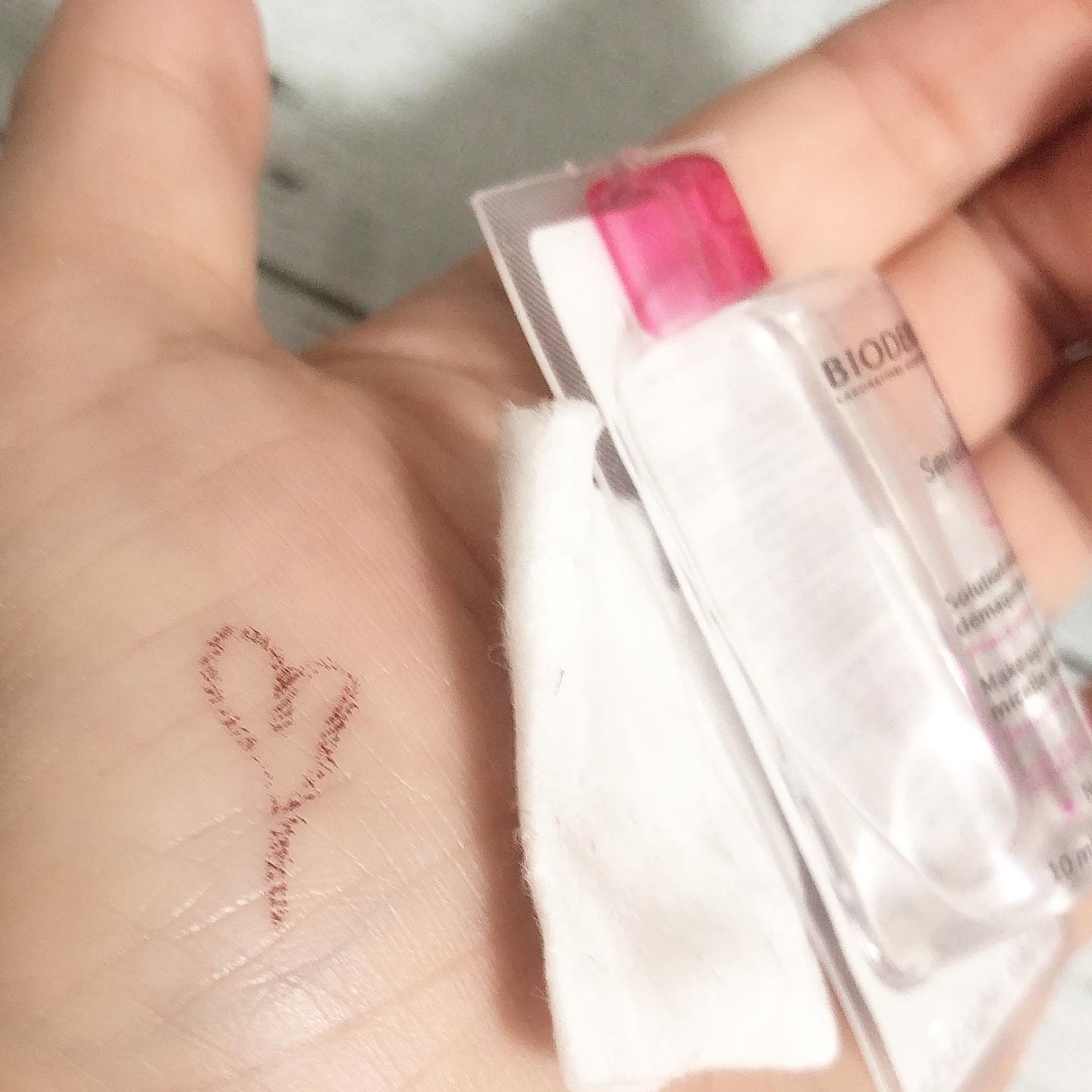 本日の#サンプルコスメ使い切り#ビオデルマ#ビオデルマクレンジングウォーター#ビオデルマサンシビオエイチツーオー#loftで買物したらコチラをプレゼントしていただきました。製品自体は肌負担少なめですがコットンの摩擦が気になってあんまり使わなくなってましたが、昔大好きだったこのアイテム。キャンメのアイライナーで書いたハートにコットンを数秒置いて軽くスライドしてこの位の落ち方。最近は気になった時だけ市販のトナーパットで古い角質除去してるからクレンジングでゴシゴシしないから購入しないけど、画像撮影後手に試し書きしたものを拭き取るには便利♪たまに角質除去として使うなら1番小さいサイズならリピートしたいかも…。#スキンケア#スキンケアマニア#スキンケアオタク#使い切りスキンケア#使い切り報告#使い切りたい#1日1捨#一日一捨#使い切れる人になりたい#サンプルコスメ使い切り週間#サンプルコスメ消費
