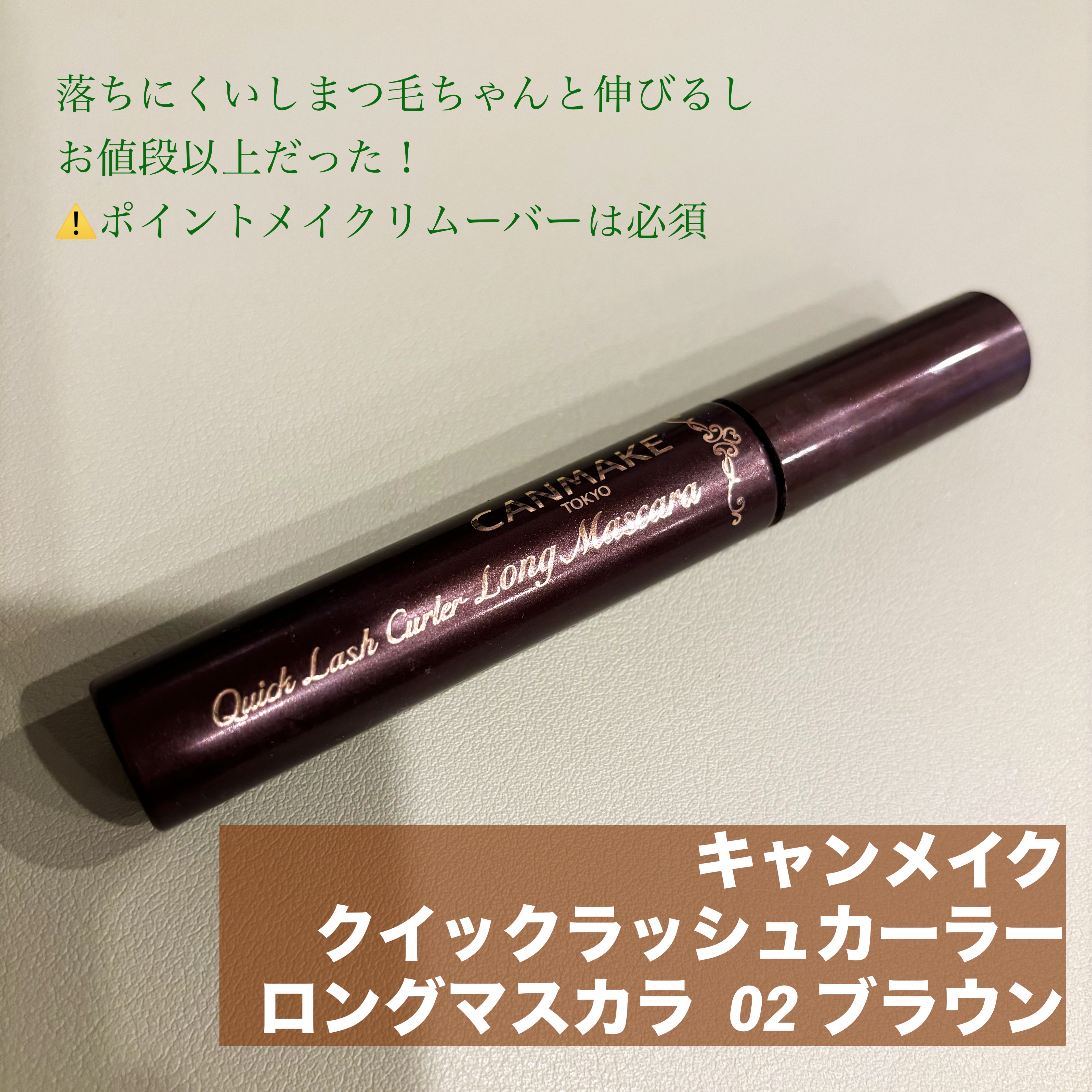 キャンメイクのクイックラッシュカーラーロングマスカラの02ブラウンです! 下地いらずでカールばっちりキープ! たっぷり繊維で、重ねるほどロングに! ずっとずっとずっとゴクブトマスカラ使ってブラシタイプに慣れてるからすごく塗りやすい! お色も美味しそうなチョコレート色🍫🤤 塗った感じも綺麗にセパレートして、ちゃんとロングに