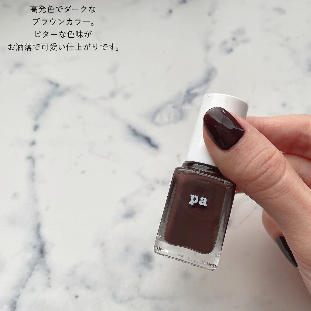 【ダークなブラウンが大人っぽくて可愛い🤎】★pa ネイルカラー A186 ¥308(税込)----------♡ダークなブラウンでお洒落 高発色なダークでビターなブラウンネイル💅🏻 ブラックより強すぎず、ブラウンより優しすぎない、絶妙な発色🤎 大人っぽくてお洒落なんです✨♡お求めやすいプチプラネイル。 カラーバリエーションが豊富でお手頃なお値段も魅力的なpaネイル💅🏻 筆は少し硬めですが、液はサラッとしている印象です✔️ 高発色なカラーで少し気をつければ綺麗に塗れました🦋♡単色でも可愛いカラー。 単色でもお洒落に仕上がる絶妙カラー💅🏻 マットにするとよりブラウン味が出て優しい印象に仕上がりました🤎 年中無休で使えそうなカラーです⭐️---------全て2度塗り+トップコート。薬指のみマットトップコートを。ダークめな締まるカラーは個人的に、やっぱり落ち着く🤎可愛いカラーに出会えました💅🏻最後までご覧頂きありがとうございました😊---------#ネイル#ネイルカラー#ネイルポリッシュ#ネイル写真#ネイル記録#マニキュア#セルフネイル#プチプラネイル#プチプラ#コスメ好きさんと繋がりたい#コスメレビュー#メイク好きな人と繋がりたい#コスメレポ#プチプラコスメ#pa#paネイルカラー#A186#セルフネイルのすゝめ
