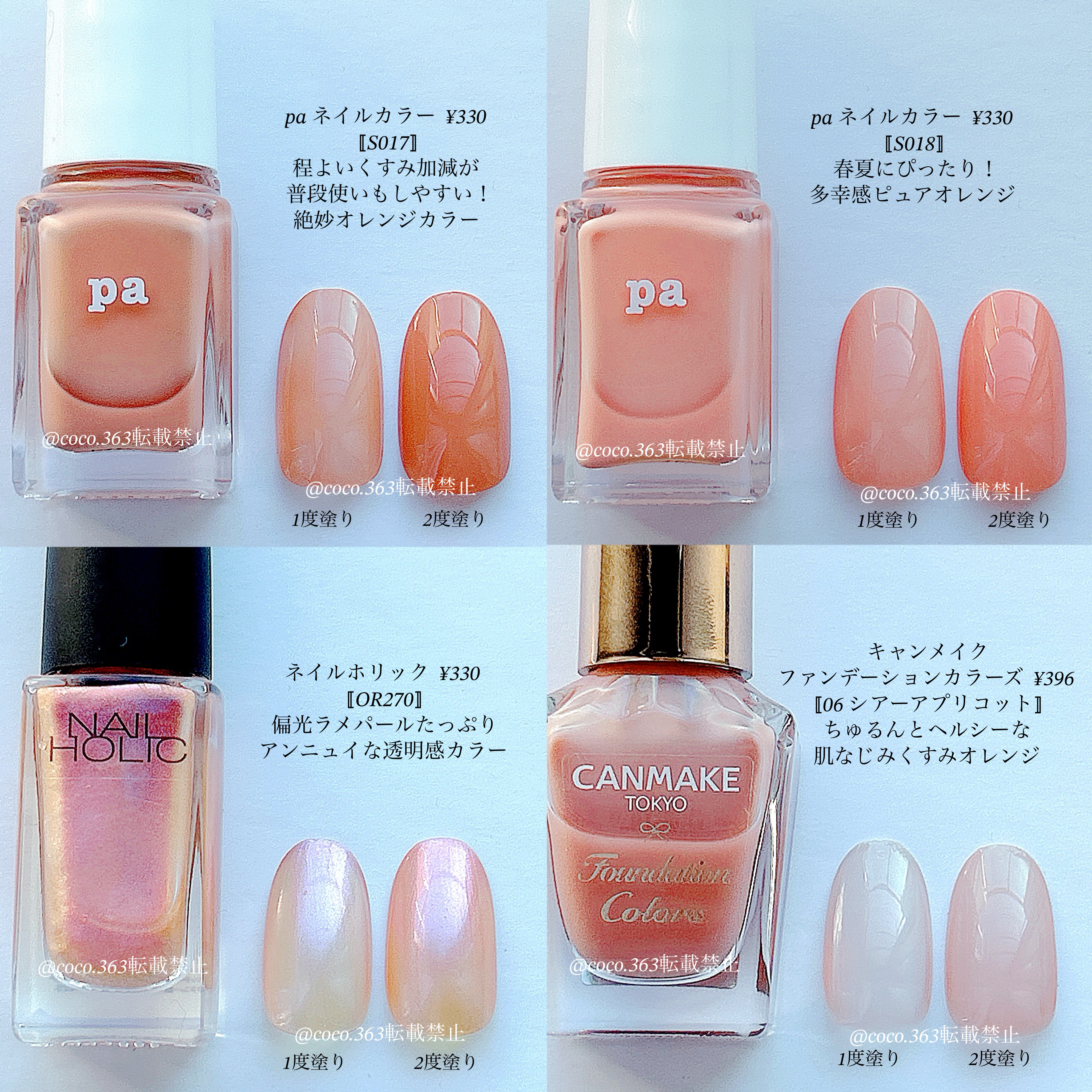 \500円以下/人気メーカーから厳選💅🏻春に纏いたいあか抜けオレンジネイル8選🧡︎︎︎︎︎︎☑︎詳細は2枚目からの画像でどうぞpaネイルカラー¥330〚S017〛〚S018〛ネイルホリック¥330〚OR270〛キャンメイクファンデーションカラ...
