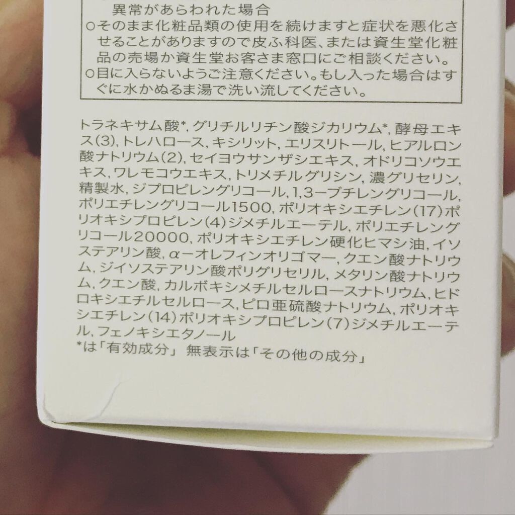 - 有効成分 トラネキサム酸、グリチルリチン酸ジカリウム その他の成分 セイヨウサンザシエキス、イチョウエキス、ヒアルロン酸ナトリウム(2)、オドリコソウエキス、ワレモコウエキス、エリスリトール、濃グリセリン、精製水、ジプロピレングリコール、1、3-ブチレングリコール、ポリエチレングリコール1500、ポリエチレングリコール20000、ポリオキシエチレン(14)ポリオキシプロピレン(7)ジメチルエーテル、ポリオキシエチレン硬化ヒマシ油、イソステアリン酸、α-オレフィンオリゴマー、クエン酸ナトリウム、ジイソステアリン酸ポリグリセリル、メタリン酸ナトリウム、ヒドロキシエチルセルロース、クエン酸、カルボキシメチルセルロースナトリウム、トリメチルグリシン、ピロ亜硫酸ナトリウム、フェノキシエタノール
