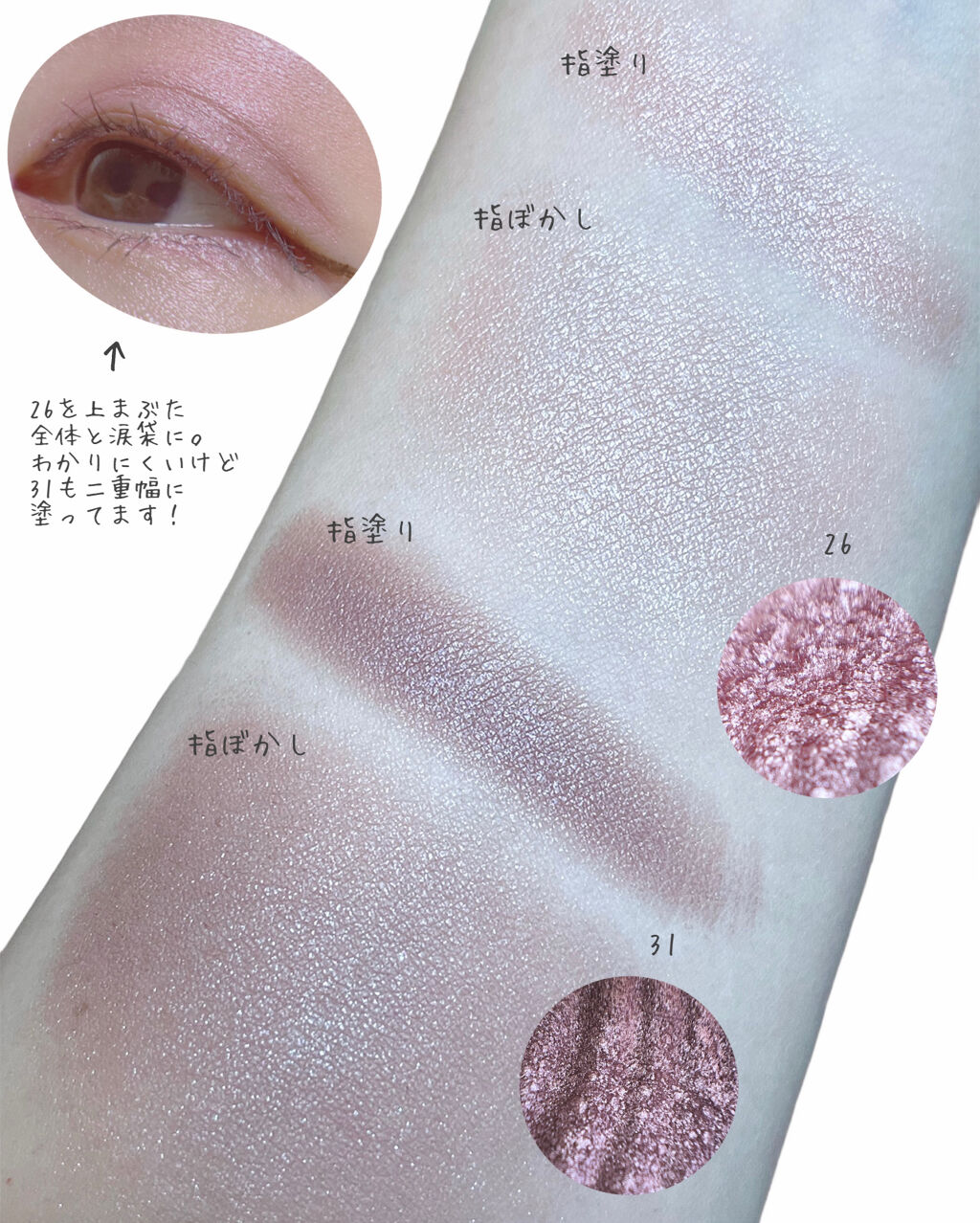 このアイシャドウ、とにかくツヤが✨ ツヤが素晴らしい😍 粉飛びもしないしまぶたにピッタリ❤︎ 26 はつやつやバレリーナピンク❁︎ 31は絶妙なプラムブラウン❁︎ 急いでる時も指でパパッと塗ってオシャレに可愛いアイメイクが出来ちゃうからめちゃくちゃ愛用してます❤︎