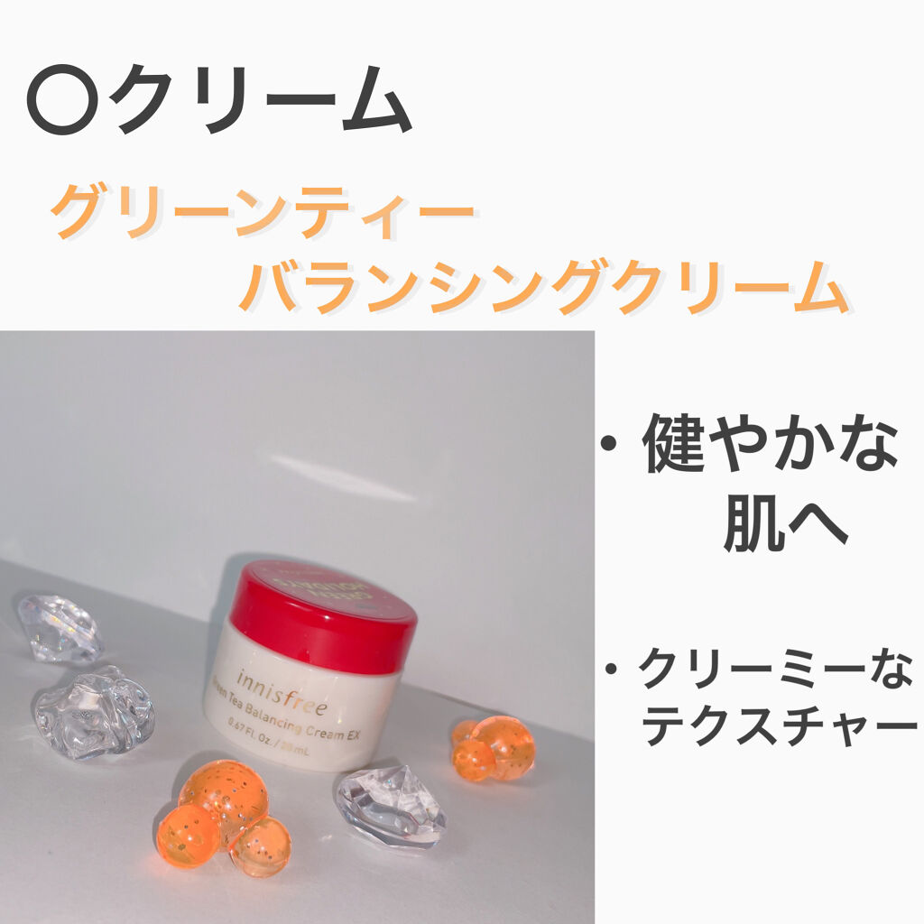 癒やされる香り!グリーンティーシリーズのトライアルを使用してみた【使った商品】①innisfree グリーンティーバランシングスキン②innisfree グリーンティーバランシングローション③innisfree グリーンティーシードクリーム【商品の特徴】〜公式HPより①〜③共通 *チェジュ島産有機栽培のオリジナル美容茶葉から独自のダブルスクイーズ製法で搾り出したエキスを配合。保湿効果に優れた16種類のアミノ酸やミネラルが含まれたチャ葉エキスでうるおい肌へと導く。 *グリーンティーウォーター*1が角層のすみずみまで素早くうるおいで満たし、グリーンティーシードオイル*2の保湿ヴェールでうるおいを逃さず包み込む。これにより、理想的なモイスチャーバランスをキープし、いきいきとハリのある肌へと導く。 *1水、チャ葉エキス *2チャ種子エキス①グリーンティーバランシングスキン *グリーンティー成分*1が肌の内側*2まで潤いで満たし、みずみずしくなめらかな肌に整える化粧水 *水のようにさっぱりとした付け心地なのに、グリーンティー成分*1だけでなく、保湿成分パンテノールを配合し、肌に潤いを届ける。 *レイヤリングに適しており、手のひらでやさしく包み込むように数回塗り重ねることにより、内側*2から吸い付くようなしっとり肌へ整える。 *1チャ葉エキス、チャ種子エキス *2角質層②グリーンティーバランシングローション *グリーンティー成分*配合で肌なじみがよく、しっかり潤いキープするエッセンスイン乳液 *チャ葉エキス、チャ種子油(保湿成分) *美容液と乳液の2-in-1 肌を柔らかくし、潤いを与える乳液、そして、肌をすこやかに保つ美容液が1つになり、肌の潤いを保つ。 *時間のない朝は、洗顔後にグリーンティーシードセラムをなじませて、エッセンスインローションで仕上げたら、2ステップでスキンケア完了。③グリーンティーシードクリーム *グリーンティー成分*1が作り出す潤いヴェールがつややかでなめらかな肌へ導くモイストクリーム *やわらかく、さらっとしたテクスチャーで肌に心地よく伸び、長時間しっとりとした潤い感が持続します。 *1チャ葉エキス、チャ種子油【テクスチャ】①〜③グリーンティーの香りが心地良い。①少しとろみのある化粧水。なぜか肌に乗せるとパウダーが混ざっているようなざらっと感がある。②ゆるめの乳液。肌の奥まで冷たくなるような感覚がある。重くはなく、べたつきはしないけれど、皮膜感がある。③やわらかい水分感の高い伸びの良いクリーム。重くはなく、べたつきはしないけれど、皮膜感がある。【感想】 グリーンティーシードセラムを購入した際についてきたトライアルセットを使用しました。トライアルなので肌への効果というよりも使用感メインでの感想です。*良いところ ・香りが良い ・特別荒れたりはなかった。*イマイチなところ ・①のバランシングスキンがなぜか肌に乗せるとパウダーが混ざっているような感じがあって違和感を覚えた。 ・トライアル用の容器だと②の乳液がなかなか出てこなくて、綿棒でほじり出して使う必要があり、イライラした。 ・②と③はべたつきとはまた違った皮膜感があり少し苦手だった。トライアルということもあり、可もなく不可もなしの印象に留まりました。香りはとても良いけれど、皮膜感が苦手かな。