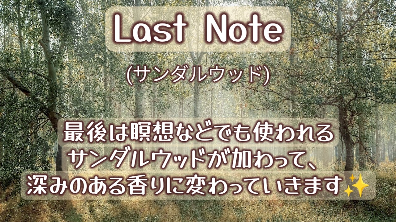 最初はみずみずしさや爽やかさを感じるフルーティーな香り🍏✨ そこから徐々に薔薇の華やかな香りや、鈴蘭の透明感溢れる香りに変わっていきます🌹 ミドルノートはとにかく透明感がすごいのでお気に入りです!!! その後は瞑想などでも使われるサンダルウッドが加わって、深みのある香りに変わっていきます!
