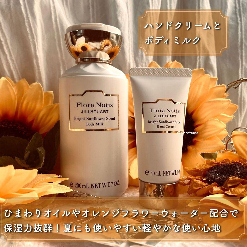 ♡万人受け清楚。ひまわり香水🌻 #フローラノーティスジルスチュアート#ブライトサンフラワー♡夏の日差しで鮮やかに。歩けば爽やか、近寄って瑞々しく。大好きなFloraNotisJILLSTUARTから、夏にオススメ、万人受け間違いなしのヒマワリの香りをご紹介。今だと公式ホームページで花の定期便「ハナノヒ365days」とコラボキャンペーンを実施中。お得な体験やプレゼント企画を実施しているので是非チェックしてみて。香調はシトラスフローラルムスクトップ シトラス、ユズミドル イランイラン、オレンジフラワー、ミモザラスト サンダルウッド、ムスク付けたては瑞々しく爽やかなシトラスどこか少し青いような柚を感じながら途中からほろ苦いオレンジフラワーと柔らかいミモザなどが混じり新緑のグリーンノート植物のフレッシュな緑の香りをしっかり感じられる中盤から最後はサンダルウッドとムスクで重みを出して穏やかにフィニッシュ。シトラスも印象強めなんですけどかなり強めに緑の青さを感じる香りでまさに夏に付けたくなる爽やかさ全快な香り🍋🌿わりと好みが別れにくいかなと思いました。清楚な真っ白のロングワンピースとベージュのつば広ストローハットに絶対似合う。個人的イメージは向日葵畑をゆらゆら歩く可愛くて元気な女の子。いつも無邪気でどこか子供らしいのにたまに見せる大人っぽい横顔がミステリアスな雰囲気を醸し出すような女性につけてほしい〜!(超限定的)第一印象とても爽やかなのに次第にしっとりと深みを魅せてくれる様からそんなイメージです🌻公式だとフレッシュピオニーとの重ね付けがオススメされてますね!今回のご紹介アイテムは#ブライトサンフラワーオードパルファン20mlミニサイズで使い切りやすく金の蓋とガラス瓶が美しい香水。大きいサイズは使い切れない💦香りを試してみたいなんて方にもおすすめなサイズ感。併せてボディケアひまわりオイルやオレンジフラワーウォーターを配合し保湿力抜群!夏にも使いやすい軽やかな香り。#ブライトサンフラワーハンドクリームエッセンスタッチでさっと手軽に保湿できる美容液のようなハンドクリームとても瑞々しい使用感なので暑いこれからの時期にもオススメ☀️#ブライトサンフラワーボディミルクひんやりとしたタッチのボディミルクは素早く馴染んでベタつきゼロ。日差しでほてった肌に潤いをチャージ、ふっくらとシルキーな肌に。こちらも軽やかな使用感で夏にオススメです!🌻爽やかな香りで眩い日差しを乗り切っちゃいましょう〜!🎐#FloraNotisJILLSTUART#香水#フレグランス#万人ウケ#デパコス#いい香り#gifted#香水オススメ#プレゼントにオススメ#購入コスメレポ#パケ大優勝アイテム#パケ買い#パケ買いコスメ