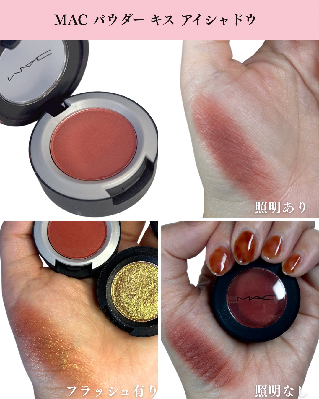 #macの#パウダーキスアイシャドウ のスウォッチです(o^^o)可愛いですねぇ🥺💓左側#ベースあり 右側ベースなし。意味あるのかなーと思いながらもベースを使ったり使わなかったりしたのですが#canmakeお安いからってなめてました。ベースあ...