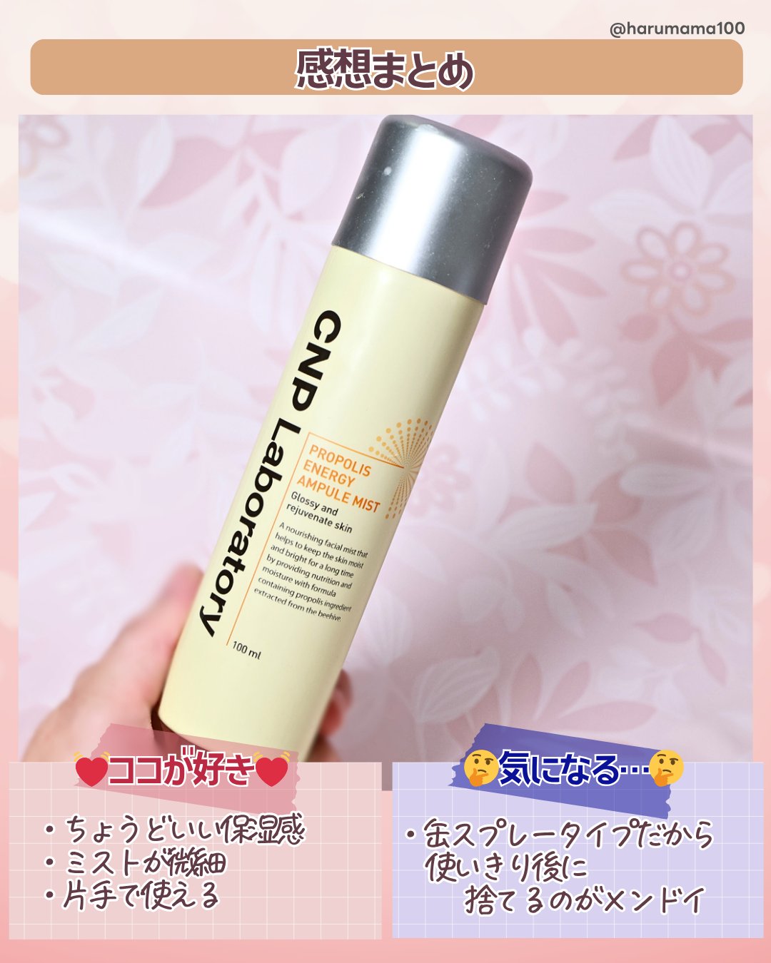 CNPLaboratoryプロPミストお気に入りの化粧水ミスト。細かいミストでふんわり肌に馴染むので、メイクの上から使うとよりメイクが密着してくれます。化粧崩れないのでめちゃくちゃ良いです。ミツバチの巣から抽出したプロポリスエキスが配合されていて、長時間保湿してくれるそうです。香りもゼラニウムの香りがして癒されます。乾燥気になる時に常にふるくらい大好きなのでみなさん使ってみてほしいです!#韓国スキンケア#ミスト化粧水#韓国コスメ#保湿ケア#保湿#ミスト#乾燥対策