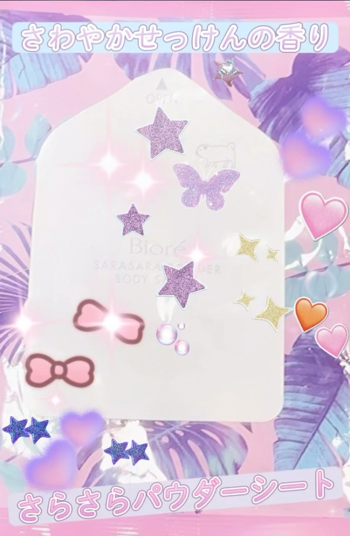 コンビニでも購入できるビオレのさらさらパウダーシートにとても助けられていますー🫧 汗をかいた後、体をこのシートで拭き取ると、汗でベタベタしていたところがすっきりして、さらさらパウダーシートのおかげで、リセットできます! サラサラになってベタベタしないので、すぐに着替えても問題なし!! 石鹸の香りも優しい爽やかな香りで良かったです!