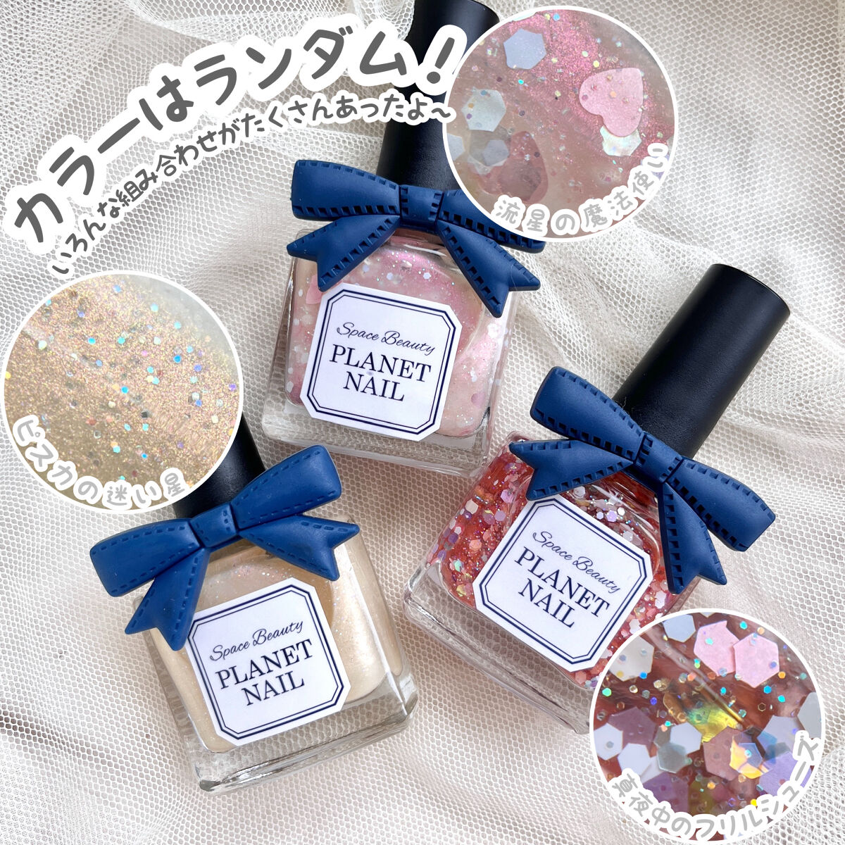 キラっキラの盛り盛りのラメとかグリッターとかスパンコールとか盛りだくさんのPLANET NAIL😮💓 ボトルにリボンがついていて飾ってるだけでもけっこうな可愛さ🎀 このシリーズ前にも購入したことあるんですがかなりヘビロテしてました🌸