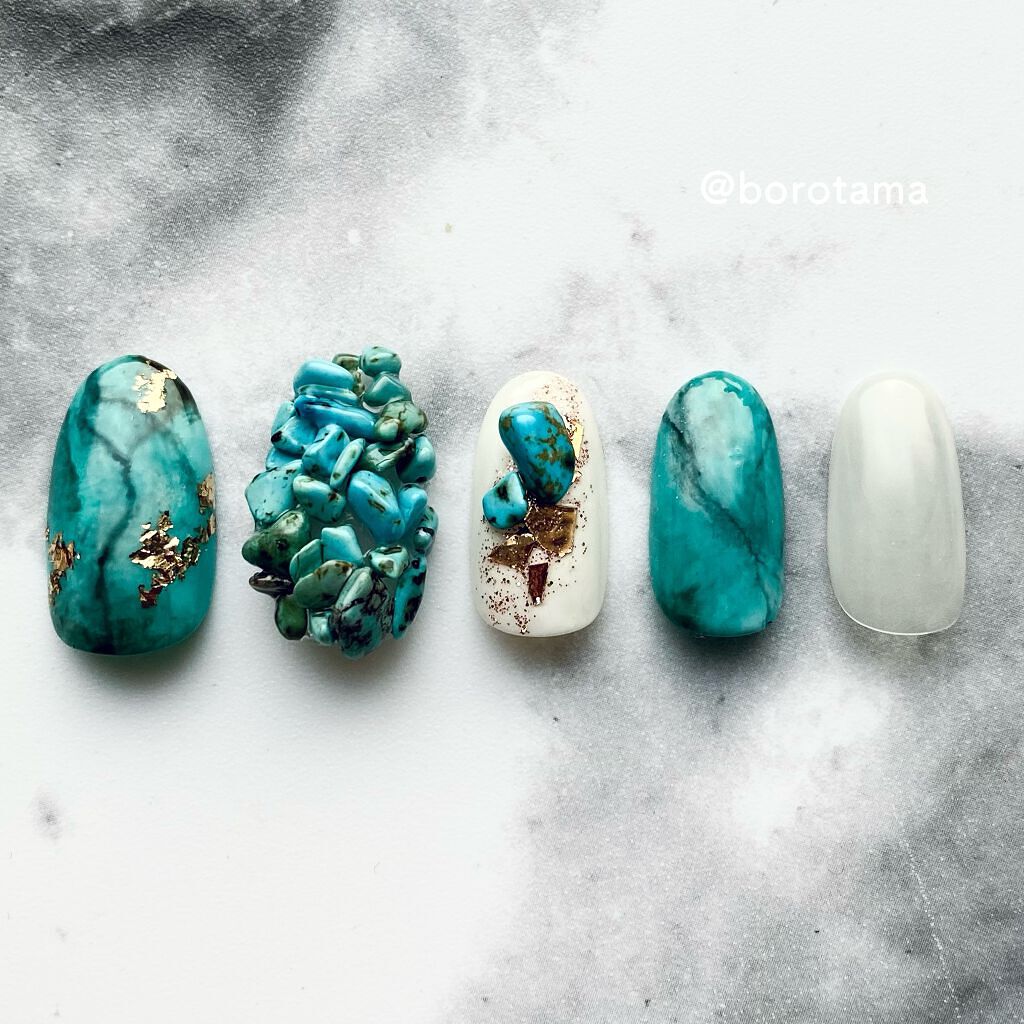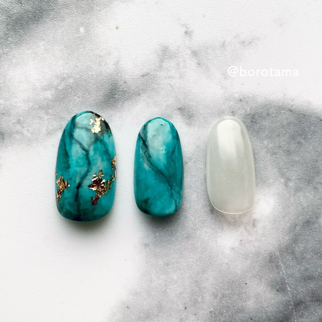 12月の誕生石番外編!12月の誕生石はタンザナイトも紹介しましたが今月は特別にもうひとつ💎ターコイズのご紹介!古くからジュエリーとしても愛用されているターコイズ。古代エジプトの墓からもターコイズの装飾品が発見されており、中国でも3000年以上も前にターコイズを刻んで、美術品を作っていたことが発見されているそうです🙄ターコイズの宝石言葉🔻🔻・成功・繁栄・健康・旅の安全空や海の大自然のエネルギーを湛えたような色を持つことから、天の神が宿る石とされていたり活力がみなぎり、夢の実現を助けてくれる、勇気や幸福をもたらしてくれる石とされているようです。別名はトルコ石とも呼ばれていますね。びっくりなことに、トルコでは採れない石だそうですよ(Ö)/‼︎主にイランやアメリカで採掘されるトルコ石。トルコ商人がシルクロードを通って広めたことからその呼び名がついたり…宝石言葉の旅の安全とはそのとき商人たちが旅のお守りとしてラクダの首につけていたから…とも言われているそうですよ〜********************♡使ったもの♡♡#セリア#SHジェルネイル(ベース&トップコート)・SHジェルネイル(トップコートノンワイプ)・SHジェルネイル(ミルキーホワイト)・SHジェルネイル(ミント)・SHジェルネイル(ダークブラウン)・SHジェルネイル(ブラック)♡#GelMe1(#ジェルミーワン)・ジェルミーワンGM-64(ピュアホワイト)♡#ネイルタウン#ニュアンスホイル(ブロンズ)#ランダムカットホログラム(ブロンズ)♡#ネイル工房#zecca筆(Angular)♡#プラネットネイル#ネイルポリッシュPLAC(#星屑シャングリラ)♡その他・ターコイズ風のストーン(かなり前にどこかの100均で購入しましたが、ダイソーだったかセリアだったか…。まだ販売があるかは不明です。)********************作り方は…初めての大理石ネイル風だったので動画が上手く撮れず😢また練習して上手くできるようになれば撮影しますね!文章の説明で🔻🔻※ベースを塗っておく①ミントを塗り硬化する②ホワイトを少量塗り、トップジェルでうすーくぼかし硬化する※全体に塗るのではなく、一部分だけ③ホワイトと同じように、ダークブラウンを少量塗り、トップジェルでうすーくぼかし硬化する④黒色を少量置き、zecca筆にトップジェルを多めにつけ、細い線になるように黒色を伸ばし、硬化する⑤周りを見ながら③を繰り返し、線を増やしたり、太くしたり調整する⑥お好みでホロを散らし、ノンワイプトップジェルで仕上げれば完成********************以上!!誕生石ネイルでした〜♡********************1月~12月の誕生石ネイル、こちらから飛べるようにしておきます!#borotama誕生石ネイル********************#ネイル#宝石ネイル#nails#誕生石ネイル#12月ネイル#ネイルデザイン#セルフネイル#プチプラネイル#ネイル記録#セルフネイル初心者#秋ネイル#冬ネイル#ターコイズネイル#トルコ石ネイル