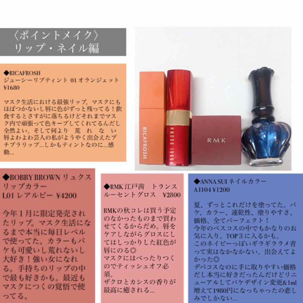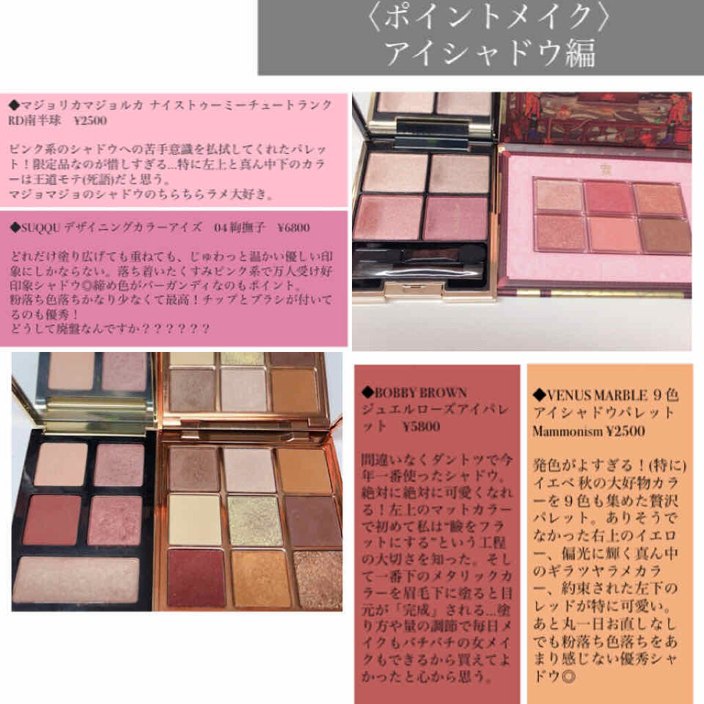ベストコスメ2020こんにちは、あめいろです☔️今回は〈あめいろ的ベストコスメ2020〉の発表です👏👏画像文字が多くて見辛いかもしれないです💦申し訳ないです🙇♀️今年はとにかく韓国コスメとデパコスとの出会いに溢れた1年でした✨コロナ禍ということもありベースメイク、アイメイクに熱が入った年でした。大好きなリップメイクが思うようにできずベスコスにもあまり選べなかったのは残念ですが、その中でも良いコスメに出会えたのはよかったです☺️限定・廃盤品が多めで申し訳ないですが、そのブランドのアイテムをおすすめしているとお考えください🙇♀️ちなみに表紙の6つのコスメは特にお気に入りのアイテムたちです✨特にアルマーニのクッションとヴィーナスマーブルのシャドウはまた後日レポしたいと思うほど…😊よければぜひ参考にしてください!#ベストコスメ2020 #下半期ベストコスメ #お気に入りコスメ#コスメ購入品 #マイベストコスメ