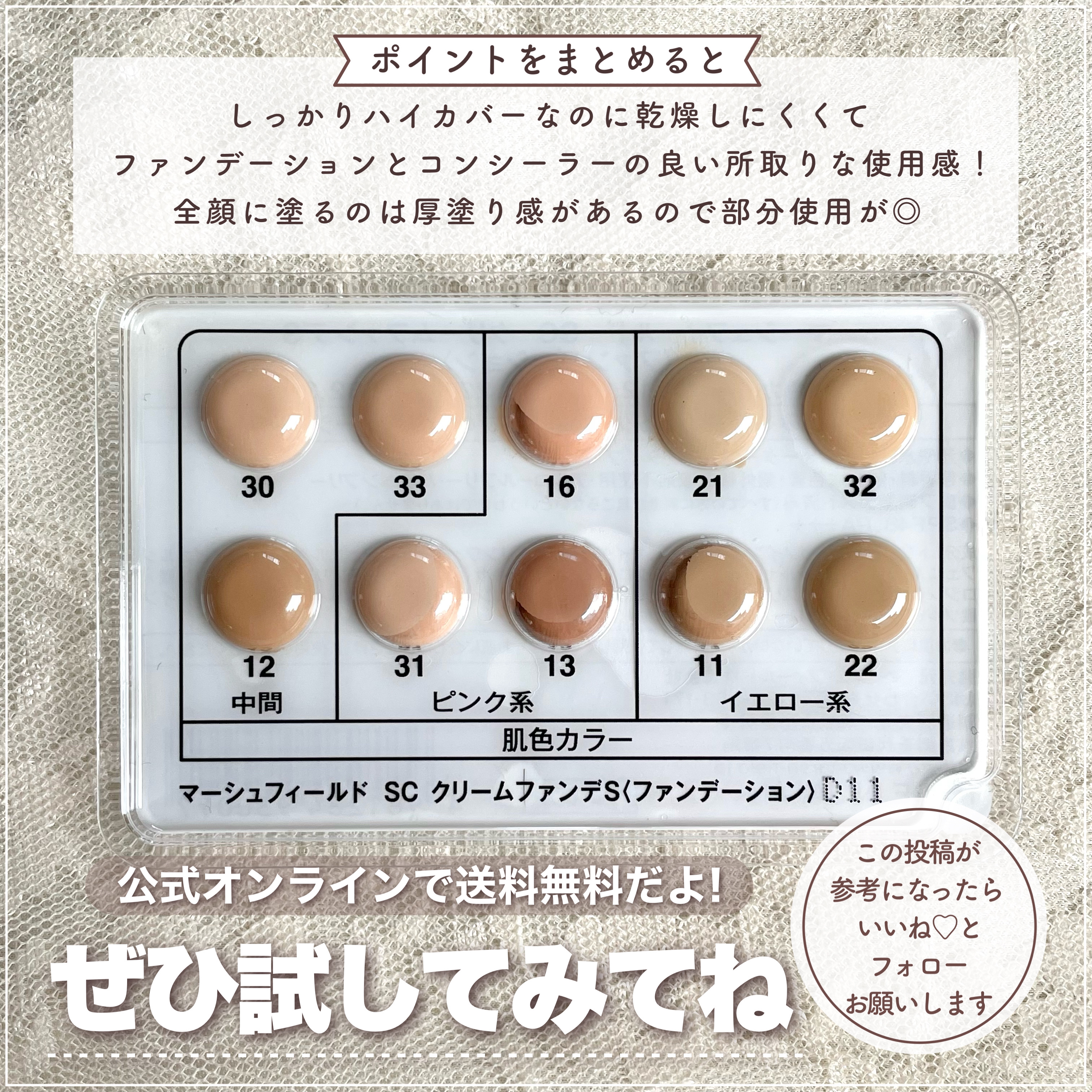 マーシュ・フィールドさんはこれまで知らなかったのですが、あざやシミ、白斑などをカバーするために開発されたカバーメイク用化粧品です! こちらのメーカーだと全顔用のファンデーションの位置付けである SC クリームファンデS、色はピンク系、イエロー系、中間色合わせて10色のバリエーションがあります。豊富! 茶クマにはイエロー、ということでイエロー系をコンシーラーブラシで塗ってお試ししてみました。 普段、標準色より1〜2トーン暗めを選ぶ私には11番がかなり自然に馴染みました。 使って初日、使い方はこれから試行錯誤ですが、目元の小じわでよれることも少なく、使用感は良い感じです。