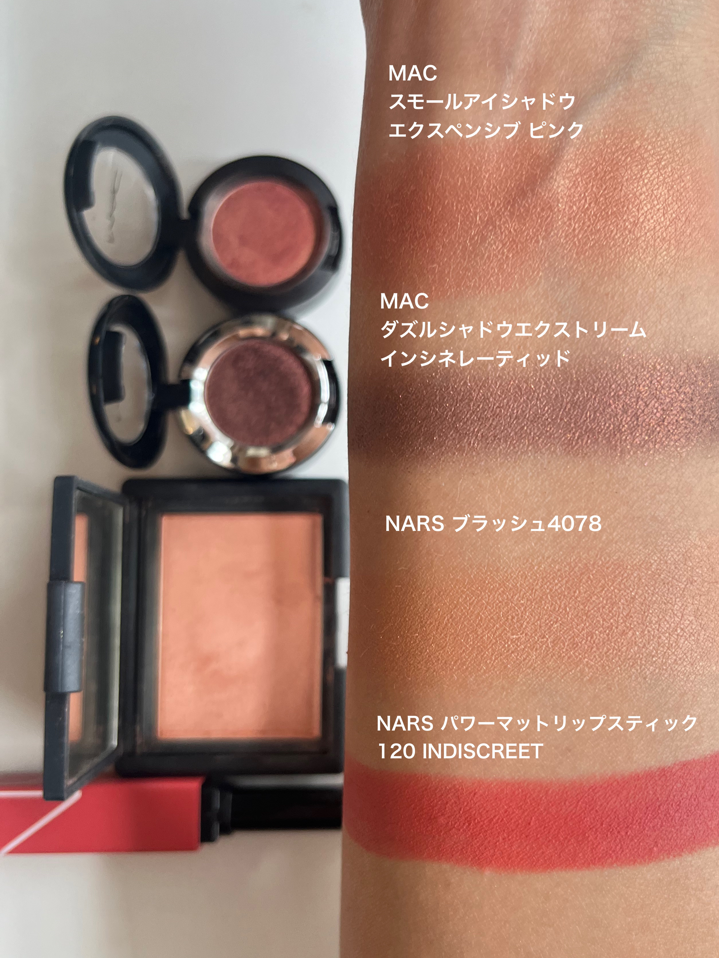 メイクアイテム•*¨*•.¸¸♬︎ アイシャドウ #maccosmetics #スモールアイシャドウ #エクスペンシブピンク (メタリックゴールドをまとった極上のピンク ) 3080円(税込) ダズルシャドウエクストリーム #インシネレーティッド (ブラウン(レッドパールの輝き)) 3850円(税込) チーク #NARS #ブラッシュ4078 (シマリングミッドトーンベージュ) 4730円(税込) リップ NARS #パワーマットリップスティック120 INDISCREET (コーラルピンク) 4840円(税込) マットな質感で、軽いつけ心地がお気に入り。 私は乾燥せず使えています🩷