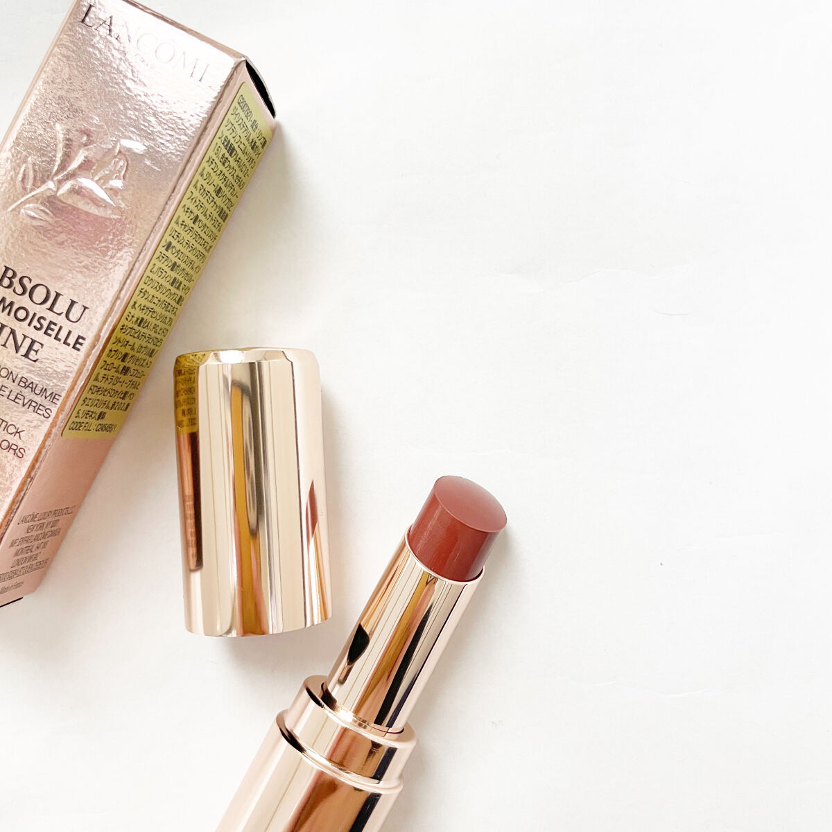 LANCOMEラプソリュマドモワゼルシャイン274ラブトゥーシャイン友人からの誕生日プレゼントで買ってもらいました。本当は、YouTubeで友利新先生が使用されていたラプソリュルージュクリームの274(フレンチティー)を購入する予定だったのですが、色味を見させて貰いこちらのラブトゥーシャインのが気に入ったのでこちらにしました。匂いは控えめですがあります。公式にはシトラスと4種のフラワーの香りとありますが、個人的にはマンゴーっぽい匂いな気がします。サンローランの匂いに似てます。サンローランの匂いは苦手なのですが、このラプソリュマドモワゼルシャインはそこまで強くないので使えました。リップに匂いがあるのが苦手な方は少し注意された方が良いかもしれません。(余談ですが、私はサンローランの匂いがするコスメが使えません。)ブラウンというよりベージュ寄りのピンクをほんのり感じる色味で、主張しすぎず血色感は出るのでオフィスでもオフでも使いやすいと思います。濃いアイメイクでもナチュラルメイクでも纏まりやすいリップです。とても柔らかく瑞々しいテクスチャーで、トゥルトゥルの唇にしてくれます。それ故にマスクにはめっちゃ付着します。でもめちゃくちゃ可愛い色味なので、マスクをしなくても良い日常になったら是非使って頂きたい。大門未知子リップ=絶対失敗しないリップマスク生活でリップが思い切り楽しめないですが、持っているだけでもしくは見えなくても塗ってるだけでテンションが上がるのがデパコスの醍醐味ですよね。#正直レビュー#lancome#リップ#ラプソリュ#デパコスリップ