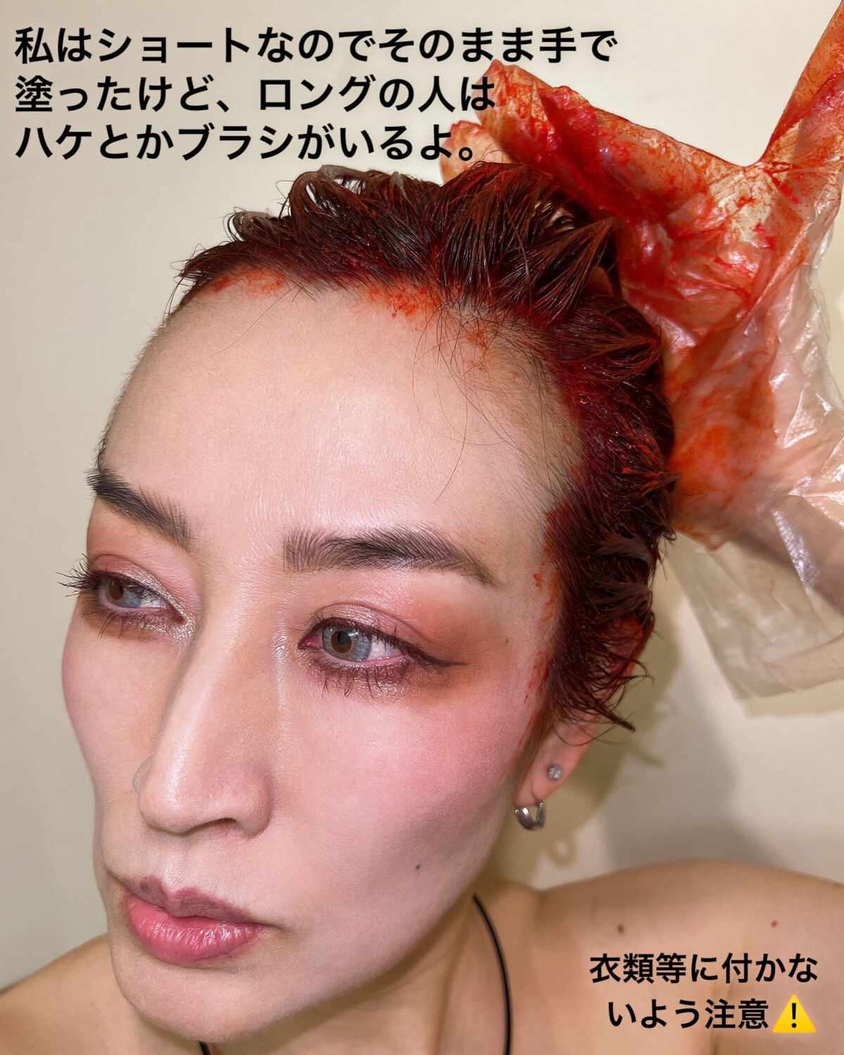 セルフで黒からワインレッドのグラデーションに。髪を赤くしたいけど、あんまりビビッドな赤はちょっと…と思い、ガッツリブリーチはせず、2回ほどセルフカラーで毛先から15センチほどを画像3枚目くらいの色まで脱色?して、got2bのロリポップレッドを使用してみました。かたーいクリームを塗り込みます、私の長さでは毛先15センチくらいでチューブ1本使いました。そして30分放置後、シャワーで流す。だいぶ念入りに流さないといけませんでした。いつまでもお湯が赤かったし、念入りに流したつもりでしたがバスタオルに少し色が着きました。汚れてもいい服か、ケープを使用するといいです。気をつけてましたが、肌に付いてしまったらしく、胸の上に少し色素が沈着してしまいました。匂いは気になる人はあると思います。どんな匂いか例えが浮かばないですが、ツンとはあまりしなかった気がします。