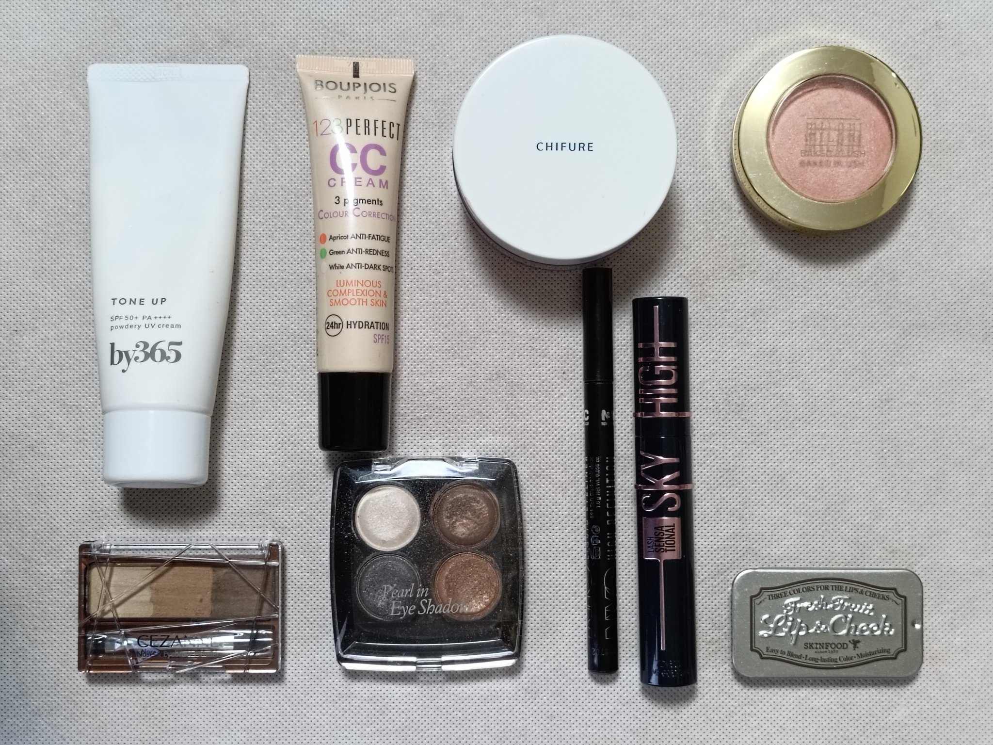 日焼け止め・化粧下地 PAUL & JOE BEAUTE プロテクティング ファンデーション プライマー 02 ハニー 顔全体に。 チーク SKINFOOD フレッシュフルーツ リップ&チーク トリオ 1 オレンジ スポンジで、ポンポン塗り。 アイシャドウベース BOBBI BROWN ティンテッドアイブライトナー 上下まぶた全体に。 アイシャドウクリーム 和粧 象棋アイシャドウ #A07 兵 涙袋に。 アイシャドウパレット リンメル ショコラスウィート アイズ ソフトマット 001 クリームショコラ メインのアイシャドウ。 アイライナー ちふれ リキッド アイライナー 筆ペンタイプ BK30 ブラック 目尻に。 マスカラ MAYBELLINE NEW YORK ボリューム エクスプレス ロケット バサバサまつ毛に。 リップ SKINFOOD フレッシュフルーツ リップ&チーク トリオ 1 オレンジ 指で重ね塗り。