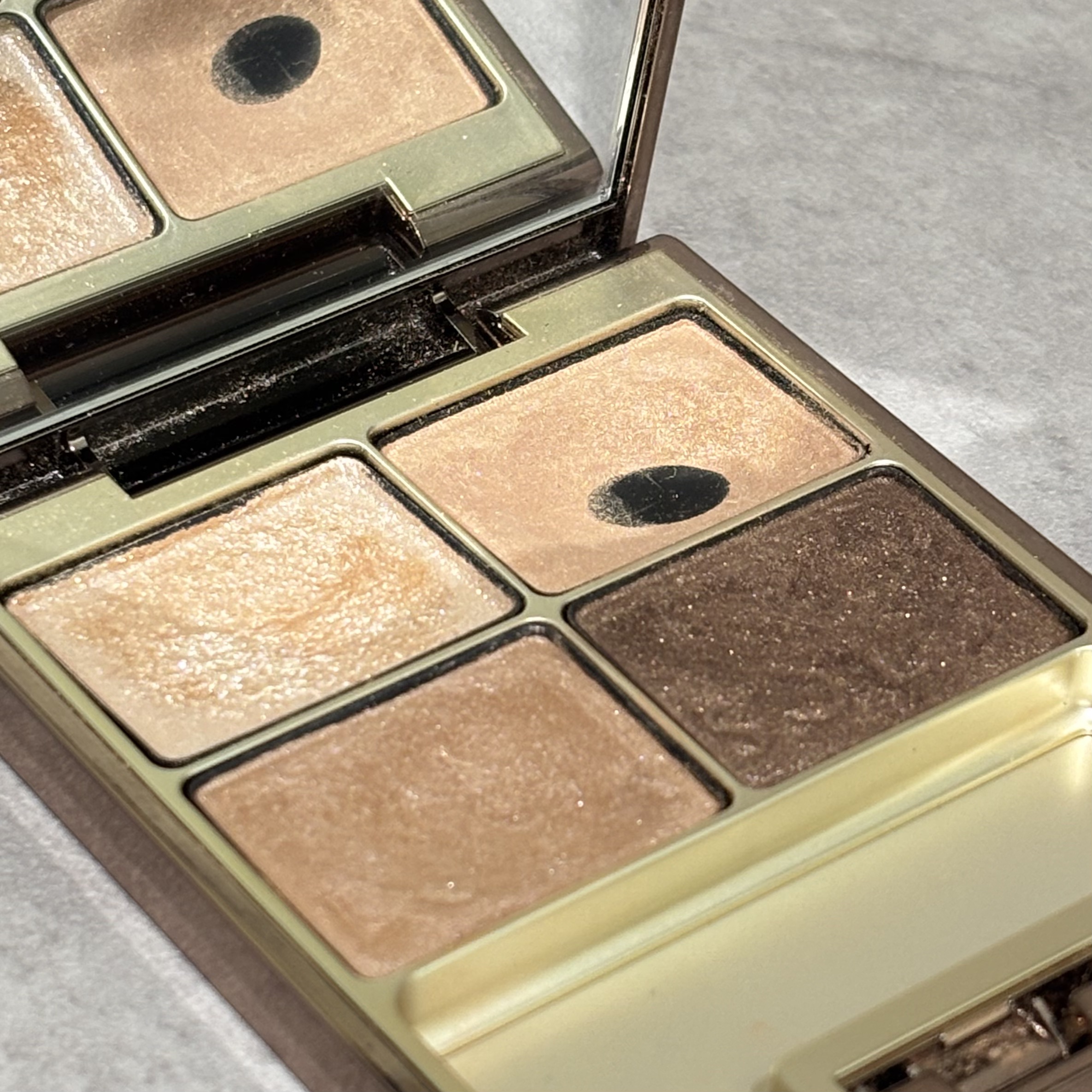 左上が明るいベージュのラメカラー 右上が黄みがかったベージュカラー 左下が使いやすそうなベージュカラー 右下が締め色の濃いめのブラウンカラー 左よりの明るいベージュカラーがラメが1番入ってます! 右上と左下がどちらもシアーなマットっぽい質感ですがちょっとラメが入ってます! 左下のブラウンはよく見るとゴールドっぽいラメが入ってて濃いめの締め色ブラウンですが使いやすいです!✨️ 鏡が大きくて見やすいのと付属のチップが2種類ブラシタイプも入っているのも好きなポイントです!☺️🪞 ラメもギラギラしすぎないラメで可愛いです! 粉落ちもしないです!✨️ オンオフどんなシーンにも使いやすいアイシャドウパレットです🫶