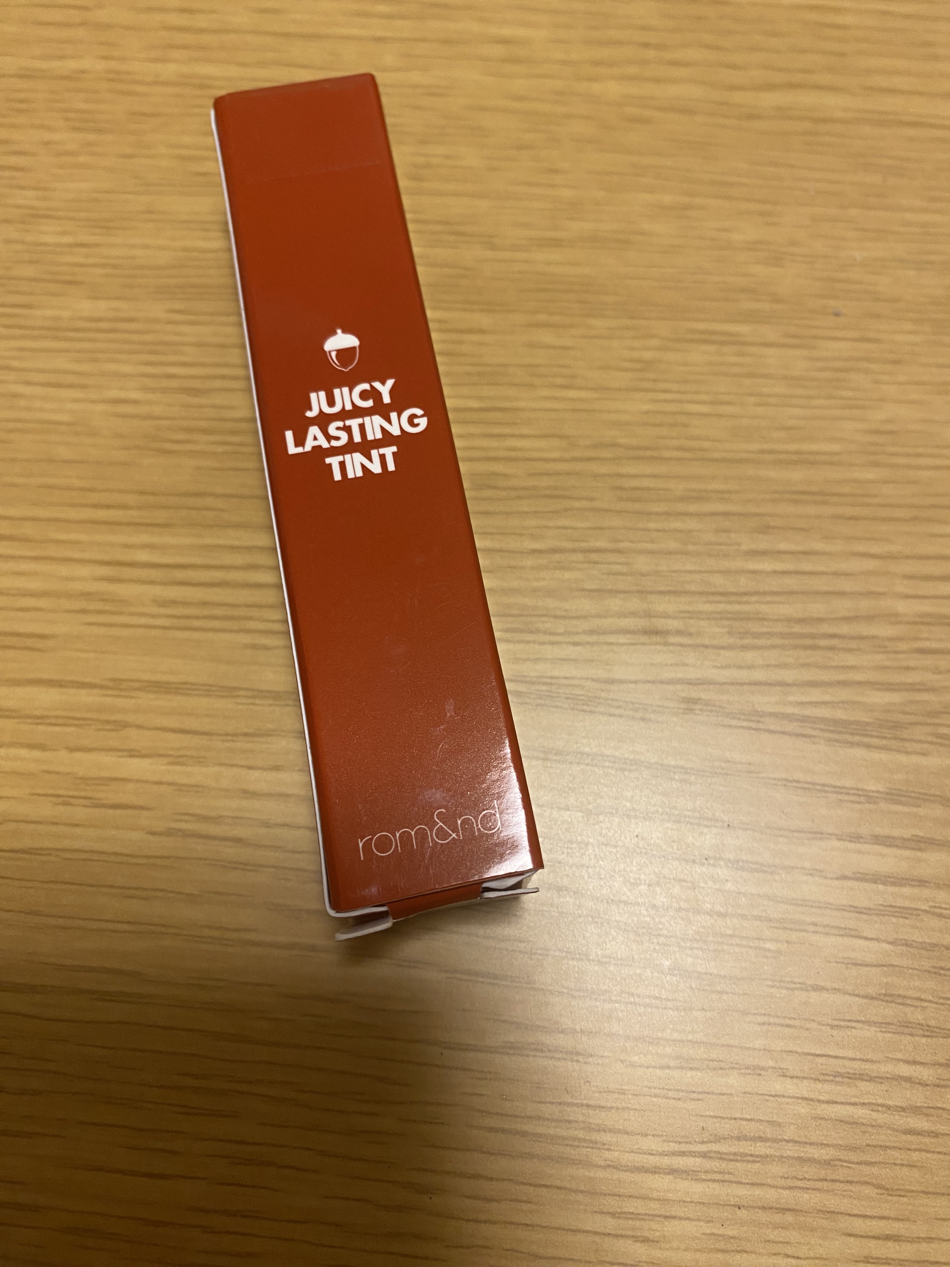 少しブラウンがかった赤いリップです! 名前の通り、ドングリのようなカラーで普段の毎日メイクからお出かけメイクまでカバーできる万能リップだと思います! イエベの方、特にオータムタイプの方にお似合いのカラーだと思いますが、オレンジっぽさに全振りしたようなカラーではないので、幅広い層の方に使えそうだと感じました! ご覧いただければお分かりの通り、かなり色が残っています! 塗ってからしばらく置いてティッシュオフをし、更にもう一度上から重ねるとマスクをしていても色が残りやすいのでおすすめです! リキッドタイプのリップですが、少しムースのようなふわふわした質感があります! カラー展開が豊富で、さまざまな場所で購入することができるrom&ndのジューシーラスティングティントです!