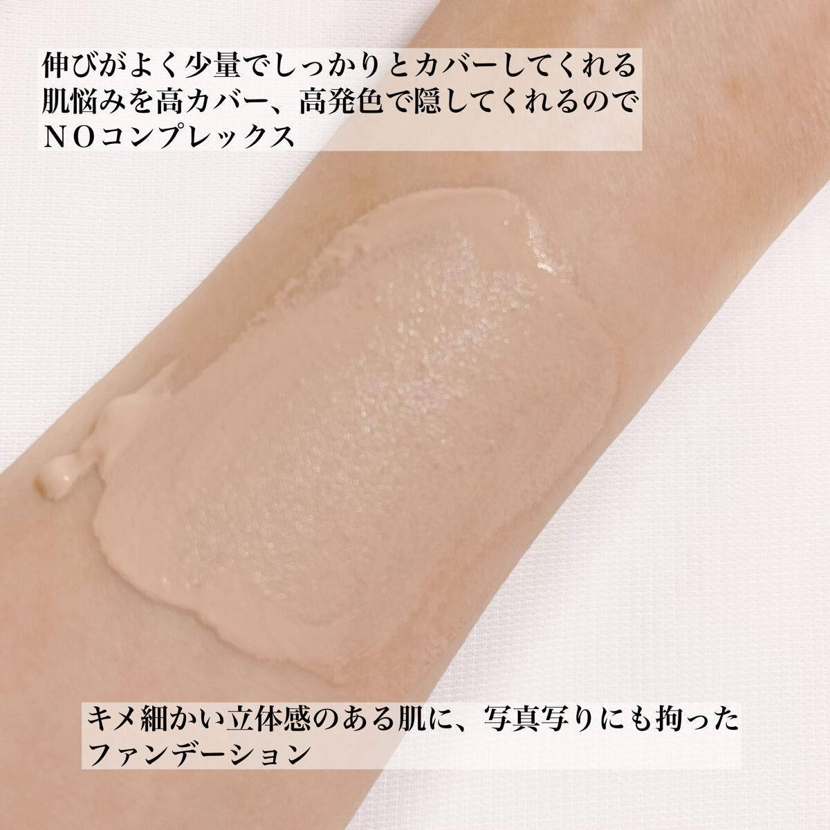 ピンクがかったベージュカラーで 血色無い方におすすめ✨ ふんわり肌悩みを隠してくれるので 厚化粧に見えにくいし、 ナチュラルメイクに最適! うるおい効果、UV効果、 ウォータープルーフ効果もあるから 乾燥崩れや塗り過ぎでの崩れにも 繋がりにくく綺麗メイクが維持できる! そして写真映えしてくれるファンデーションだから フィルター無しでも盛れる✨✨ 無加工でも盛りたい方は必見! 肌悩みが多くて完璧にカバーしたい方は 物足りなく感じるかもですが、 肌悩みは完璧にカバーしなくても良い方、 元々肌が綺麗な方、 無加工でも盛りたい方に とってもおすすめです!