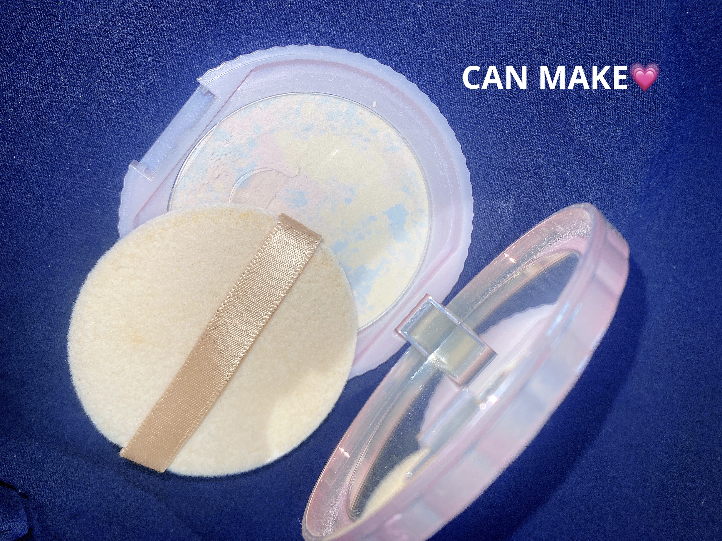 水色、ピンク、黄色っぽいカラーが混ざり合っていて肌に乗せた時にどんなかなと気になってかいました💛 さすがキャンメイクのパウダー!粉っぽい質感ではなく柔らかくてタッチが滑らか! ぼちぼち肌のくすみが飛ぶかな〜ってくらいです