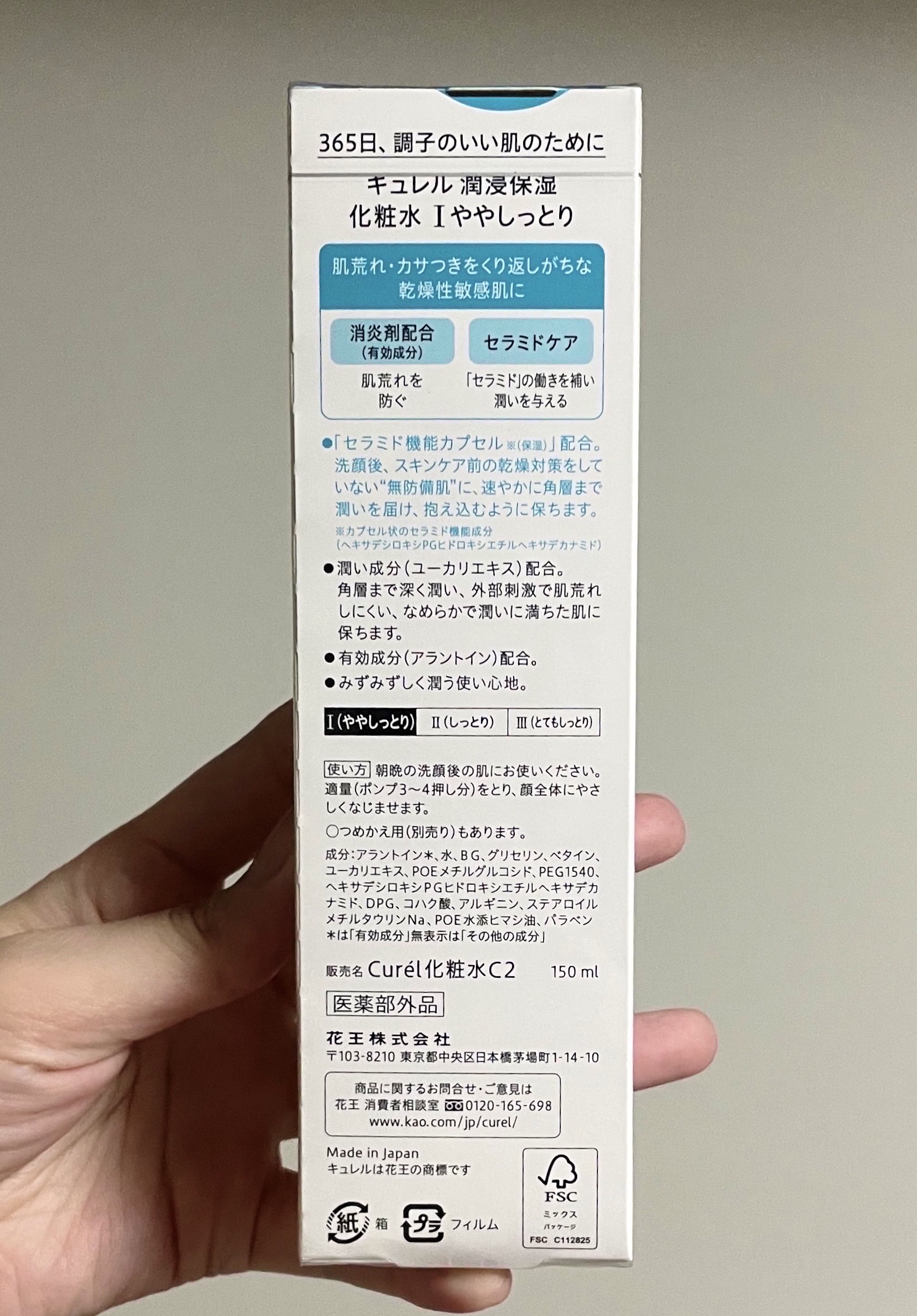 🎀キュレル 潤浸保湿化粧水Iややしっとり本体150ml ¥2,090〜初めてキュレルの化粧水購入。もともと頬は乾燥気味、おでこ、鼻、口周りは皮脂が多めの肌質で、保湿しすぎてもニキビができやすい。保湿足りないと肌が突っ張るという難しいタイプ。ニキビに効きそうなクーリング効果のある化粧水はもともと使っていて、保湿成分もある化粧水が欲しくて購入してみました。グリセリンが多い化粧品を使うとニキビができやすいと感じるインナードライ肌。グリセリンについて↓↓①グリセリンは「水分を引き寄せる力」が強い•肌の奥が乾いていると、角質層の水分がさらに引っ張られて蒸発しやすくなることもある。•→インナードライの人は一時的に「潤ってる気がする」のに、時間がたつと乾燥+毛穴づまりが起きやすくなる。②グリセリンは少し重めの保湿剤•表面に“膜感”が残ることがあり、これが皮脂と混ざって毛穴を詰まらせる要因になるケースも。•特に「しっとり系」「とろみ系」の化粧水はグリセリンが多めに配合されていることが多い。③人によっては“ニキビ誘発因子”に反応する•グリセリンは「コメドジェニック(毛穴詰まりを起こしやすい)」とはされていないけど、•皮脂量が多いインナードライの人+敏感肌の人は反応することもある。キュレルはややしっとり、しっとり、とてもしっとりなど自分の好みに合ったものを選べるのも◎キュレルの化粧水に含まれているグリセリンはわりと控えめらしい。✼••┈┈••✼••┈┈••✼••┈┈••✼••┈┈••✼公式サイトより肌荒れを防ぐ。潤い成分配合で、角層まで深く潤う。●「セラミド機能カプセル※(保湿)」配合。洗顔後、スキンケア前の乾燥対策をしていない「無防備肌」に、速やかに角層まで潤いを届け、抱え込むように保つ。●潤い成分(ユーカリエキス)配合。外部刺激で肌荒れしにくい、なめらかで潤いに満ちた肌に保つ。●消炎剤配合。肌荒れを防ぐ。●とてもしっとり潤う使い心地。 ※カプセル状のセラミド機能成分(ヘキサデシロキシPGヒドロキシエチルヘキサデカナミド)【医薬部外品】容量150ml/全6種✼••┈┈••✼••┈┈••✼••┈┈••✼••┈┈••✼⭐️全成分⭐️成分:アラントイン*、水、BG、グリセリン、ベタイン、ユーカリエキス、POEメチルグルコシド、PEG1540、ヘキサデシロキシPGヒドロキシエチルヘキサデカナミド、DPG、コハク酸、アルギニン、ステアロイルメチルタウリンNa、POE水添ヒマシ油、パラベン *は「有効成分」無表示は「その他の成分」香り・色・味○弱酸性 ○無香料 ○無着色○アルコールフリー(エチルアルコール無添加)#キュレル#潤浸保湿化粧水Iややしっとり#化粧水#スキンケア#混合肌#インナードライ肌