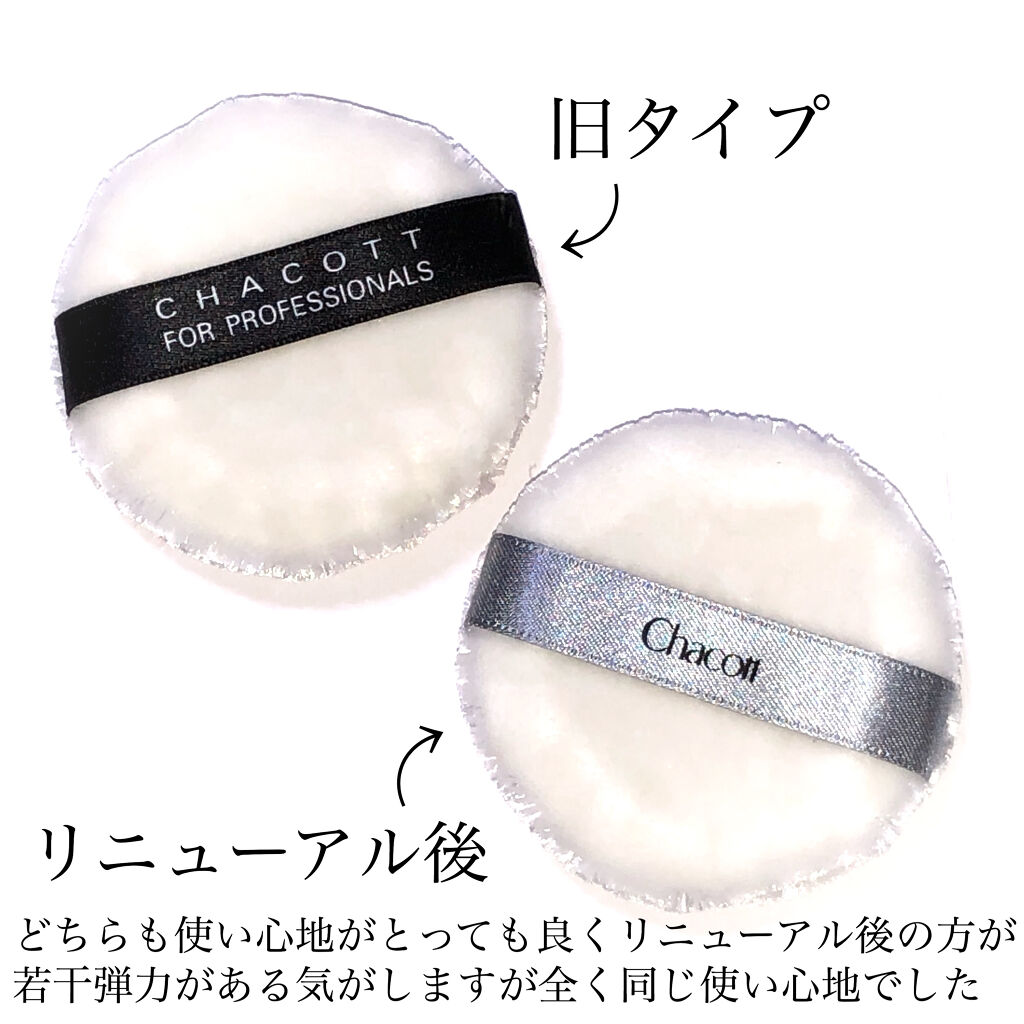 肌触りが良すぎる人気のパフがリニューアル✨__________________________________□商品情報□ブランド:チャコット商品名:パウダーパフ2個入り(旧タイプ)販売価格:税込¥660-購入可能場所:ロフト、ショップインなど□商品情報□ブランド:チャコット商品名:パウダーパフ2個入り(リニューアル)販売価格:税込¥660-購入可能場所:ロフト、ショップインなど__________________________________旧バージョンのチャコットのパウダーパフもリニューアル後のチャコットのパウダーパフも直径約6cmと持ちやすく、扱いやすい大きさで固すぎず柔らかすぎず程よい柔らかさと約1.5cm程の程よい厚みのあるふわふわなパフになっています✨このパフは、生地が国内の老舗ビロード織工場で開発された毛足が4mmと長めのビロード生地でパフの繊維が細かい為、しっかりパウダーを含み粉飛びせず、ムラなく快適に使用できるだけでなく表面がビロード生地でふわふわの為とにかく肌触りが優しくお肌に触れると癖になってしまう程とっても心地が良く◎どちらも使い心地がとっても良くリニューアル後の方が若干弾力がある気がしますが全く同じ使い心地なので旧タイプのパフを使用していた方にももちろん◎お値段も何度も洗えて使用できるパフが2個入りで税込660円とリーズナブルなお値段なのでお粉用のパフをお探しの方や少しでも気になった方は是非チェックしてみてください✨#chacott#パウダーパフ