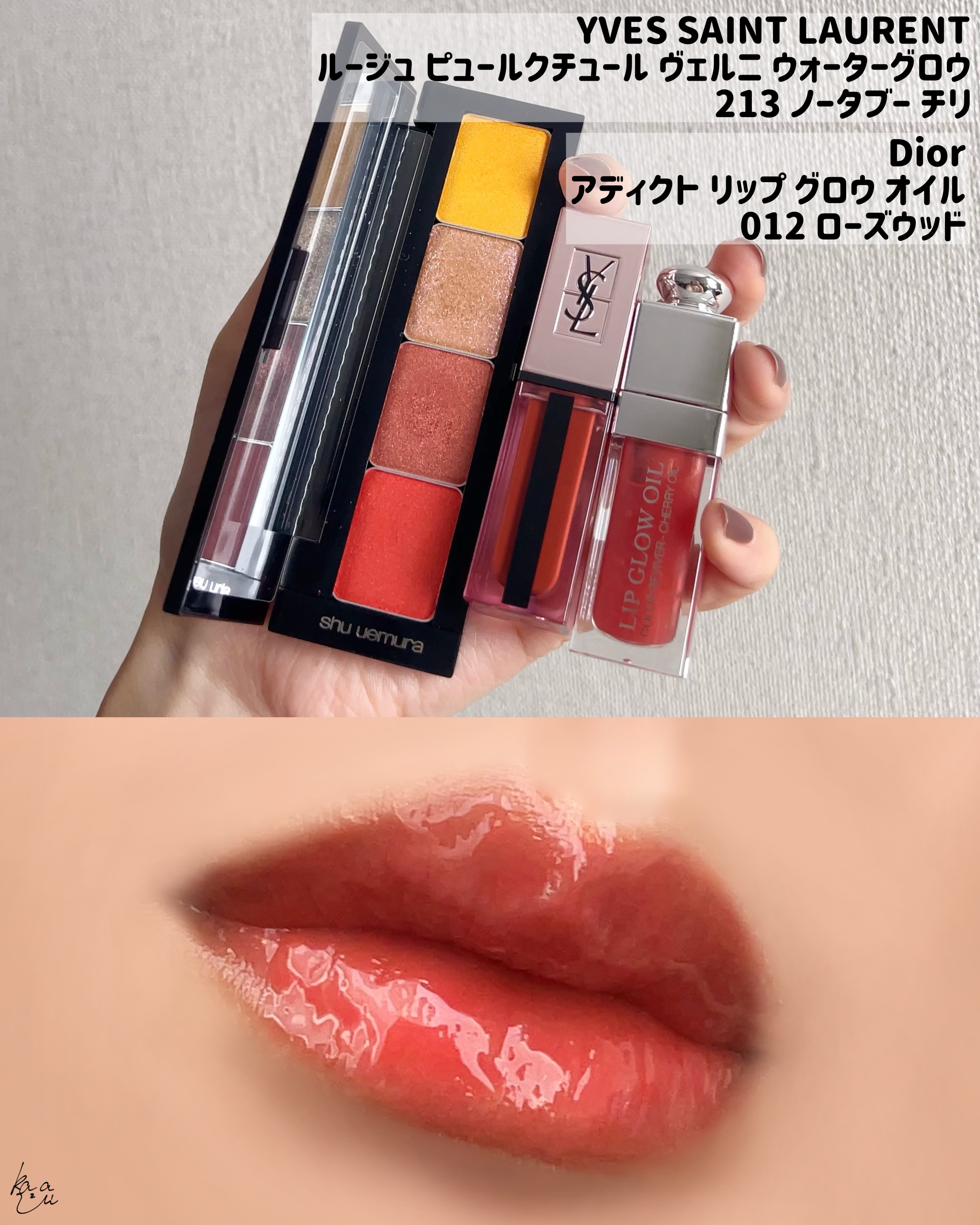 メインカラーはモミジコッパー ウォームイエローが他には中々ないTheイエローでめちゃめちゃ可愛い☺︎ リップはもう廃盤のYSLのリップ 上からDiorのリップオイル重ねてちゅるちゅるに