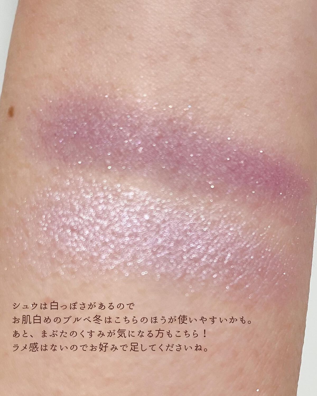 明るいオレンジ~コーラル系のカラー。見た目以上にツヤが綺麗! ぎらっとしないのに自然と出るツヤ感が美しい✨ 黄みが苦手なブルベなのですが、唯一持ってるイエローアイシャドウも シュウのものなら使えるんだよね…… それくらいシュウはPCにとらわれず挑戦できる 使いやすさがあります👌🏻 こちらもシマー系カラーでツヤが綺麗! 私は青みを吸いやすいので、 優しい系統のパープルはほほ無色になりかちですが、 こちらのパープルはしっかり発色💜 優しく洗練された雰囲気のラベンダーカラーで、 ブルベさんには特に使いやすいカラーです。 ほんのりピンクを感じるのも キツくなり過ぎなくて可愛い🫶🏻 ラメ枠はラストラスライラック。 繊細な粒が綺麗にみっちり詰まってて、 けどメタリックさはなく自然なラメです◎ 一見ただのブラウンですが、 名前の通り柔らかいウォーム系ブラウン。 やや赤みが入ることで、締めすぎず ふわっとしたやわらかい印象になります。