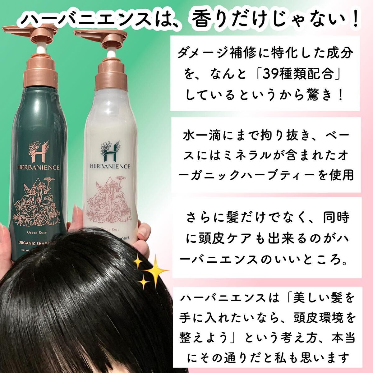 ハーバニエンスは、香りだけじゃない‼️ ダメージ補修に特化した成分を、なんと「39種類配合」しているというから驚き! さらに髪だけでなく、同時に頭皮ケアも出来るのがハーバニエンスのいいところ。 それらを天然成分だけでつくりだしているのがとても素晴らしいなと...。 シャンプーの泡立ちの良さ、スッキリするのにきしまず、うるおいを感じる仕上がり。 さらにコンディショナーは1品3役の役割りを果たす万能さ🙆🏻♀️ つるんとなめらかな仕上がりが好きです☺️ 使用感のよさ、仕上がりも大満足🙆🏻♀️ 芯からうるおって見える、美しさと輝きのある髪!