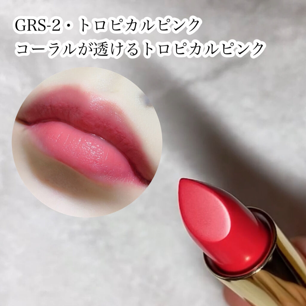 - 底面をカチッと押して取り出す形状のルージュです。体温付近に融点を持つメルティフィットオイルが、唇にのせた瞬間にとろけて滑らかな塗り心地。密着性の高いスーパーフィットオイルが唇へピタッとフィットし唇のうるおいをしっかりキープ。ひと塗りで美人オーラをまとった唇に仕上げます。シアーな発色でグロスのようなツヤ感。GRS-2・トロピカルピンク:コーラルが透けるトロピカルピンク