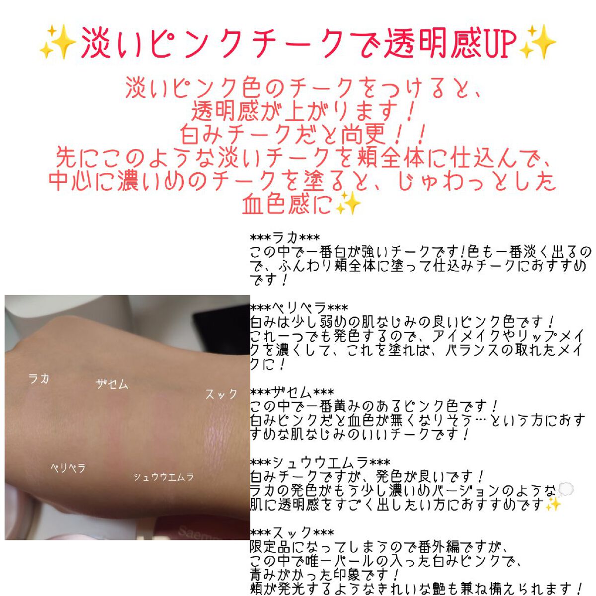 皆様、こんばんは🌙🍀今回は最近ハマっている白みピンクチークをご紹介させて頂きます!最近透明感を出すようなメイクにハマっており、研究している日々ですが、白みのピンク色のチークが透明感を出すのに力を発揮すると思いました!また、韓国アイドルのようなふんわりほっぺを演出するのにもとても大活躍です!透明感を出すなら白の混ざったピンク色のチークを頬全体に塗るだけでも、とても透明感が出ます!また頬全体にこのような白みのがかったチークを塗り、中心に濃いめのチークを入れると内側から滲み出るような血色感になります!チークのグラデーションを作るのが苦手な方は濃い色を塗って、上から淡いチークを塗ると簡単にぼかせて、グラデーションのようになると思います!白みがかったチークは血色が悪くなる…という方にはザセムやペリペラのようなものだと、白がそこまで強くないのでそちらをおすすめします!スックは限定品で番外編にはなりますが、この中で唯一パールが入っているので向き不向きがあるなあと思いました💭これ以外はすべてパール無しなので、使いやすいと思います!同じような系統でアンプリチュードの05のチークが気になっています!ここまでお読み頂きましてありがとうございました🍀✨またよろしくお願い致します!#チーク#透明感#韓国アイドル#laka#ペリペラ#ザセム#シュウウエムラ#スック#ピンクチーク