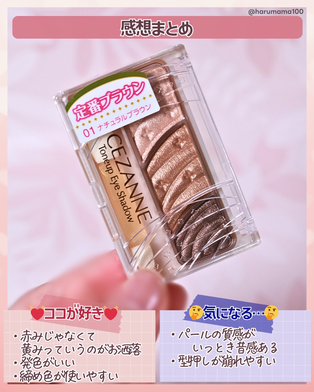 こんにちは🍒今日はわたしが愛用しているセザンヌトーンアップアイシャドウについてレビュー♥️✨これは普段、仕事でもプライベートでも使ってます!01ナチュラルブラウンなので、なんでも合うやつですね✌🏻これは多分ブルベイエベ問わず使えるんじゃないか...