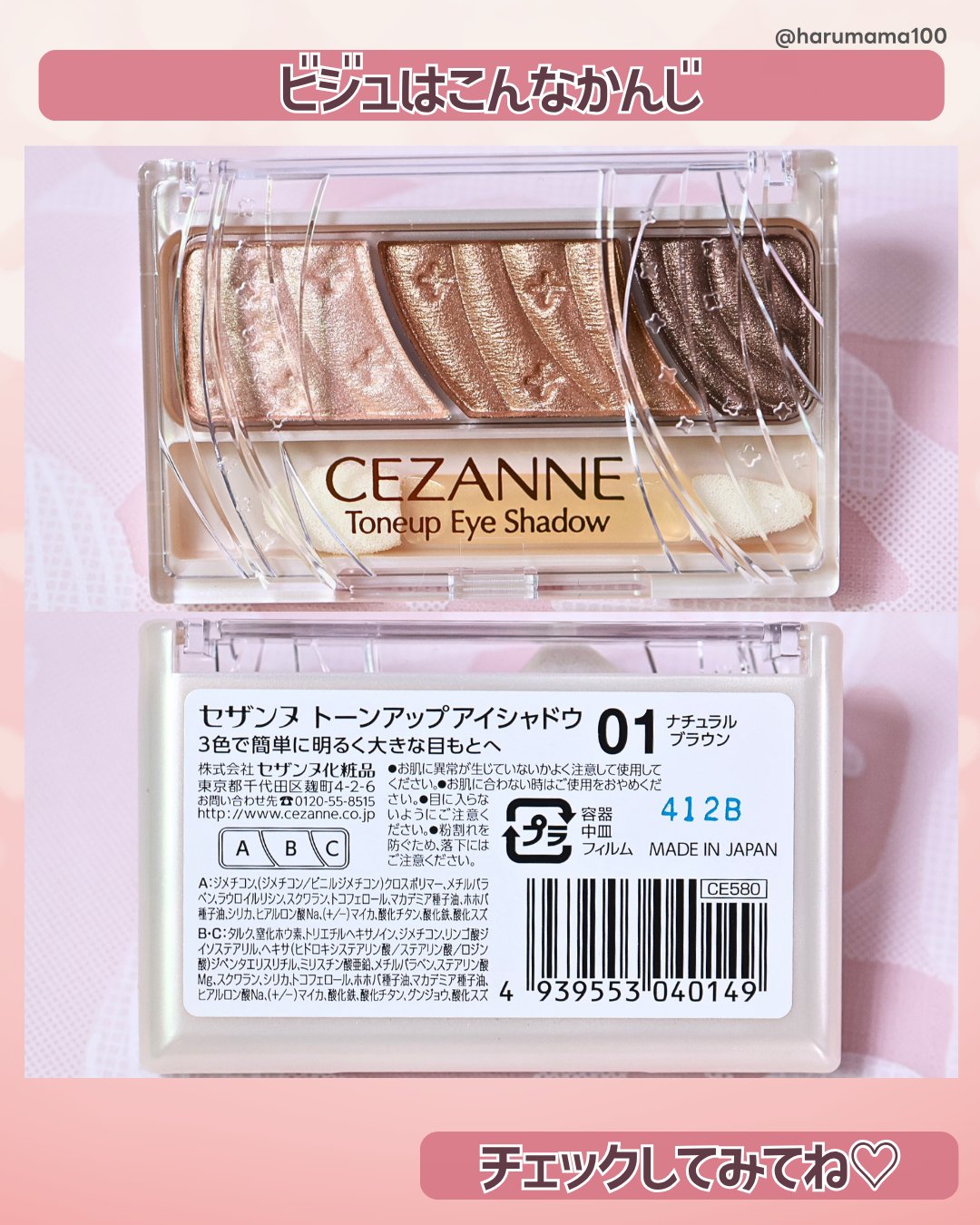 デイリーメイクに!!プチプラで優秀すぎるだろー!もう何回リピしたかわからないCEZANNEトーンアップアイシャドウ01ナチュラルブラウン忙しい朝もこれさえあれば、ハイライトまで入れれちゃう!①の明るい色も絶妙なラメ感と色で涙袋のところに使うに...