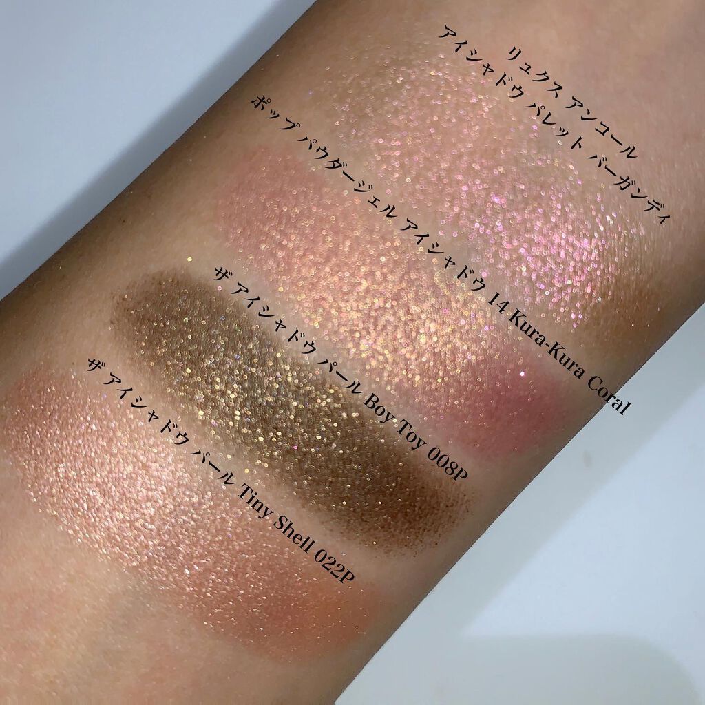 最近使ってなかったアイテムを集めたメイク😇 ナチュラルめな色味だけどキラキラにしました✨ リュクスアンコールパレット使ってる?← リュクスアンコールの右上をアイホールのベースに。 クラクラコーラルをアイホールと下まぶた目尻に。 Boy Toyを二重幅と下まぶた目尻キワに。 Tiny Shellを目頭に。