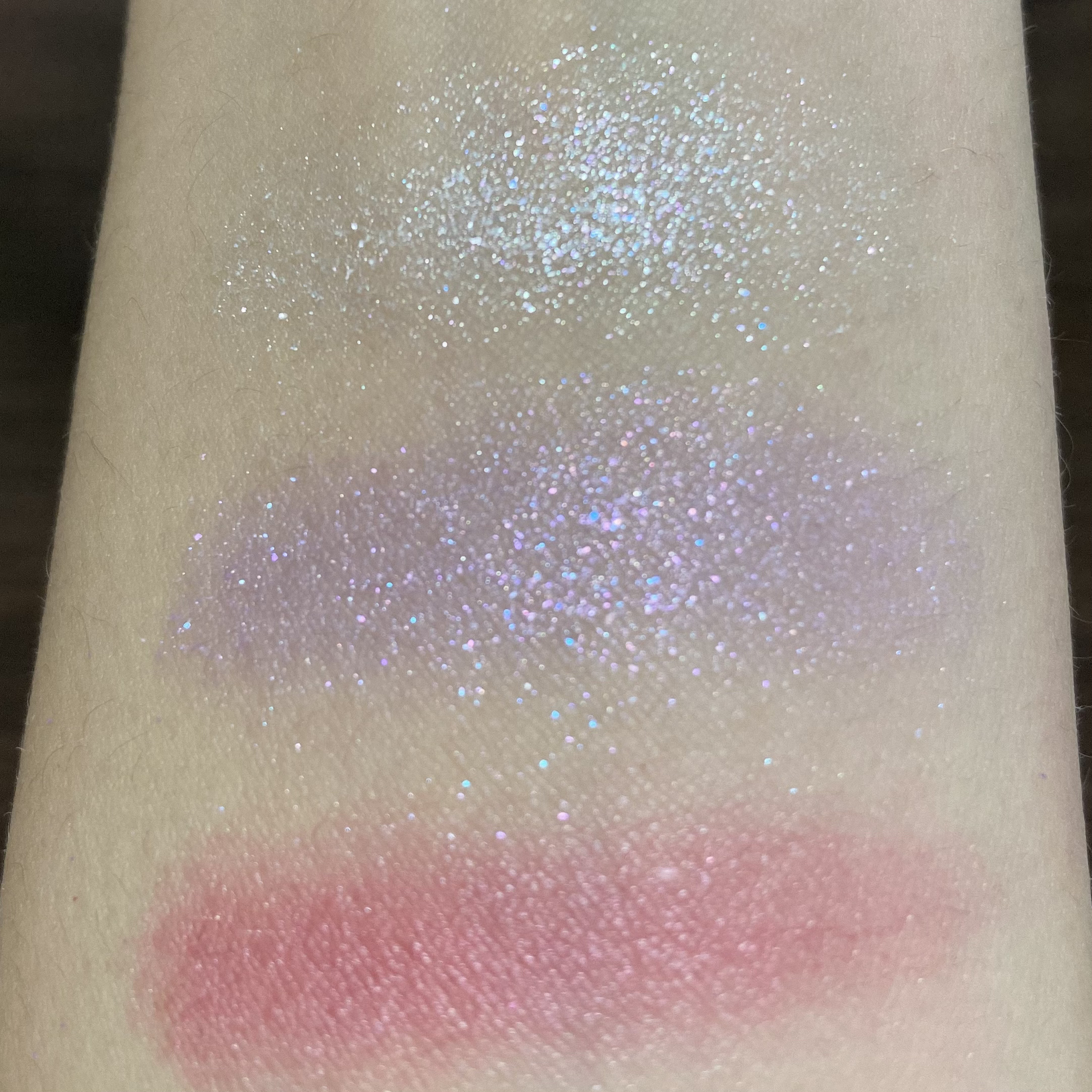 透明感あふれる色と輝きで、ピュアでセンシュアルな目元を演出してくれる三色セットアイカラーです✨ 上の2色は高輝度パールを最高水準量配合していて、透明感のあるラメが華やかな目元にしてくれます。 全体的にクリアな発色なので強い印象になりにくく、宝石のようにきらめくラメがほんっっとにかわいい。 さくらたんのステージメイクはパープルの衣装に合わせてこのヴィセのパープルラメを中心に使用されていたような仕上がりだったのですが、実際に使ってみるとこのパープルラメが可愛すぎる!!! 透け感のある仕上がりなので目元に自然に馴染んで華やかな仕上がりがアイドルメイクにぴったりだな〜と実感しました。 韓国アイドルに興味がない方もこのヴィセのアイシャドウのラメのきらめきがとっても可愛かったので、コスメ好きさんには是非チェックしてみていただきたいです🪄