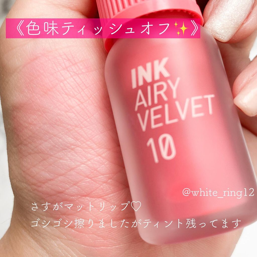 PERIPERAインクエアリーベルベット#10ツウィンクルピンキズム韓国語が読めないのでたぶんです。福袋にてゲットしました。ほんまにエアリー言うてるだけあって軽い!!!つけてる感じがないです!ですがその分密着してくれてなくすぐに取れてしまうのに感じます。PERIPERAということに期待を持ちすぎかたもしれません普通のリップよりは落ちにくくリップのベースに塗るには十分です星5☆☆☆☆☆ないと生きていけない愛してる星4☆☆☆☆リピあり 別のカラーも購入予定 星3☆☆☆リピはしないけど好き 別カラーは買う可能性あり星2☆☆まぁまぁ 星1☆私には合わなかった