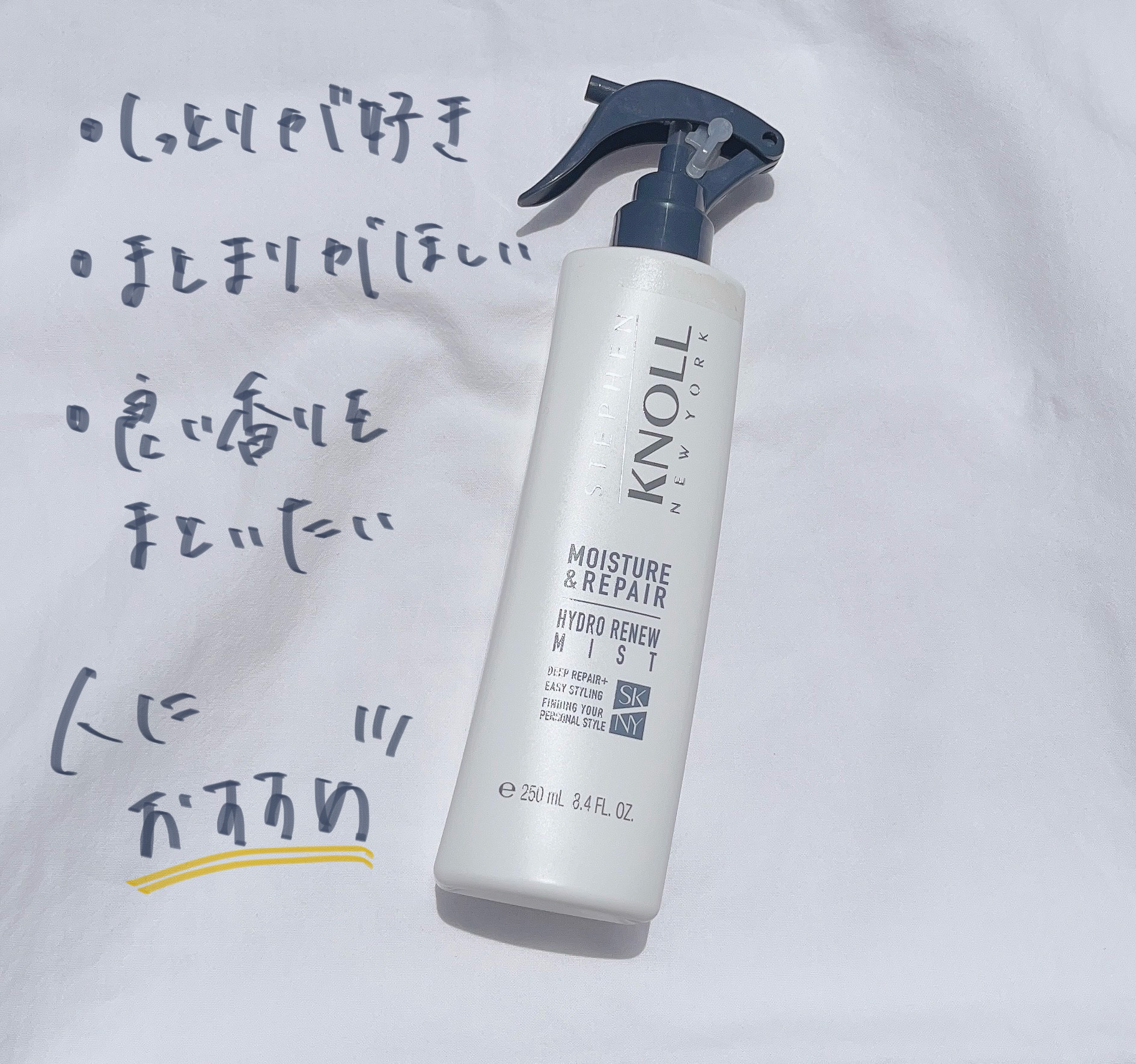 【ハイドロリニューミストモイスチュアリペア】愛用してるミストタイプの洗い流さないトリートメント🛁トリュフエキス・アミノ酸セラミド・コレステロールを内包させた高浸透カプセルを配合髪の芯まで浸透して、深層ダメージを補修してくれる!ミストタイプだから手に出さなくていいし放射状に広がってくれるから時短にもなる⏳しっかり1日中しっとり潤ってくれるから髪の毛広がりにくくなる🌿#KNOLL#洗い流さないトリートメント#ヘアケア#アウトバスケア