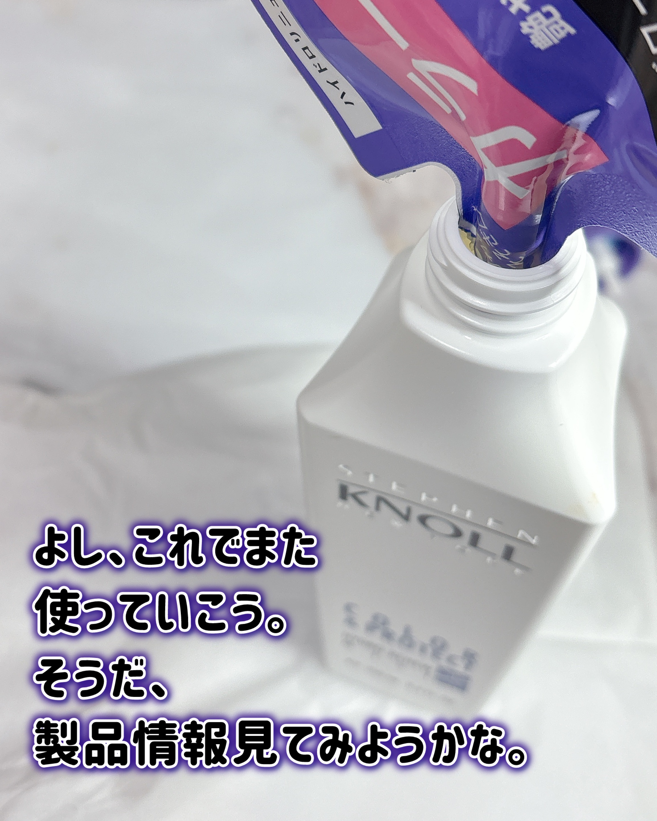スティーブンノルニューヨークのハイドロリニューミストカラープロテクト、詰め替え用230ml使い切ったから、詰め替え用買ったよ!!減り方から見て、女家族みんな使ってたな……詰め替え用がすごく使いやすい!!赤丸の部分を見てほしい、切り取り線が入ってるから、不器用な方でも切ってはいけない部分を切らなくて済む。詰め替え口が固定されてるから、口がへにゃっと倒れたり、口から微妙に溢れることがない浴槽用洗剤詰め替えと比べてしまってる人間の言葉です。トリートメントメントミストだから、泡が溢れないのがいい薬局によっては、スティーブンノルシリーズのシャンプー、コンディショナーのサンプルが付いてる#使い切りスキンケア