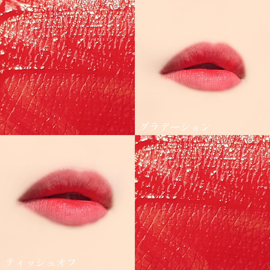 リップグレイスは、神秘的に煌く、グレイズフィニッシュの高発色ウォーターティント💎 唇に完全密着し、一日中鮮明な発色をキープ✨唇の表面に薄い水分膜をコーティングしたような上品なつやを与える。 顔色をパッも明るくするトーンアップリップカラーが、ベタつかずしっとりしたぷっくり唇に💋 大理石×ゴールドの上品でかわいいデザインが最高🤍 香りは上品なお花の香りがします💐(ダリアのようなラベンダーのような香りがします)持続性はなく、キツくないので使いやすい👍🏻 アプリケーターは両面、唇にフィットしやすい型。 仕上がりは塗りたてはツヤっぽく、しばらくするとベルベット質感に。程よくしっとりし、マットすぎないため、唇が乾燥しにくいと感じました🌸 色は鮮やかな赤い色ですが、ベルベット質感の少しフワッとした雰囲気で緩和され、どぎつくない赤みのリップです💄 鮮やかな赤リップが好きな方に特におすすめです😉✨