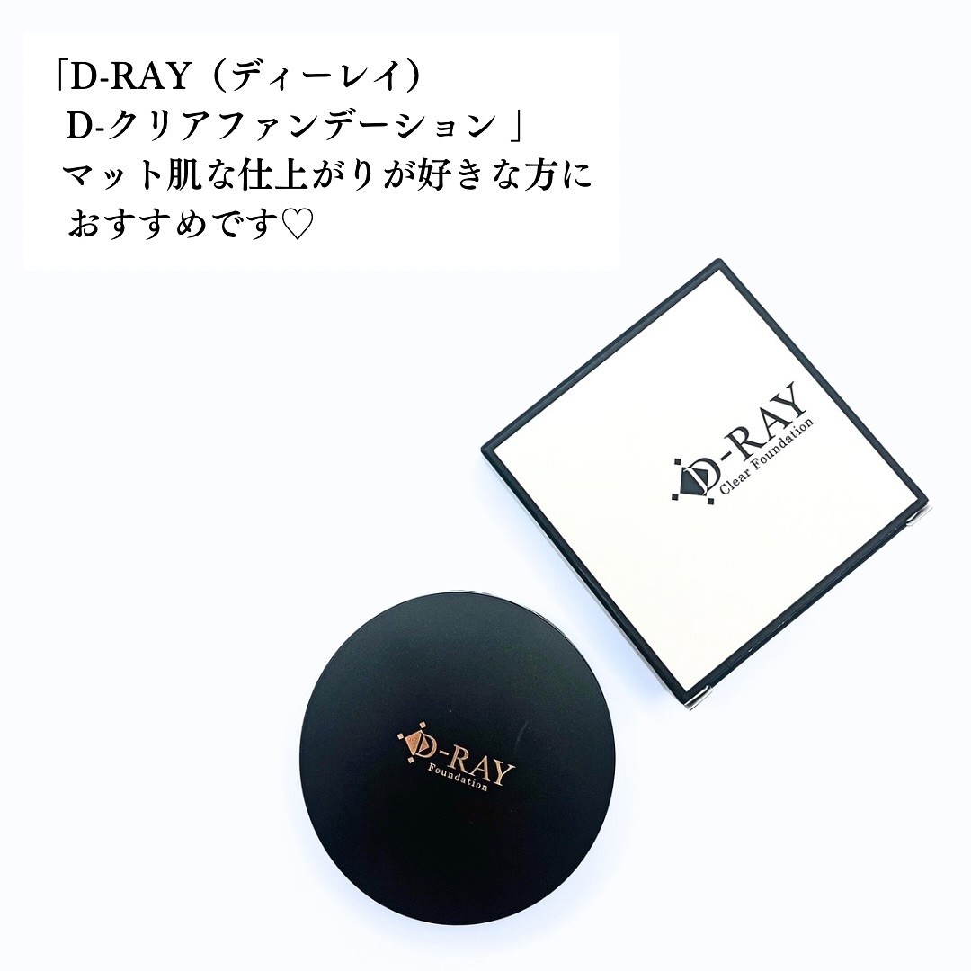 D-RAY☑︎D-クリアファンデーションこちらは超微粒子処方✧*。きめ細かい微粒子で肌のくすみをカバーしてくれるファンデーション´-Point𓂃⧉☑︎絶対に妥協できないメイクキープカメイク直しの手間いらず余分な皮脂を吸着!テカリを抑えて1日中崩れにくい陶器肌へ☑︎肌に負担をかけないSPF15PA++相当※※製造元の製造基準値による値肌への優しさを考えて必要最低限のSPF値に(紫外線吸収剤フリー)☑︎美容成分もたっぷり配合長い時間、お肌に接するものだから肌を健やかに保つ美容保湿成分を配合(パールエキス、ビタミンC、ビタミンE)実際に使用してみて𓂃⧉微粒子なので厚塗り感なく肌悩みをカバーしてくれます⠉̮⃝サラっとした使用感で肌馴染みも◎付属のパフもありますが個人的にメイクブラシを使用するのが好きです♩(フィルターをかけたようなナチュラルな仕上がりになります⠉̮⃝)また、時間が経つほど、きめ細かい粒子が肌に馴染み、メイクしたての肌よりちょっと時間が経った肌の方がより綺麗に見える時間差仕上げも嬉しいPointです✧*。#PR