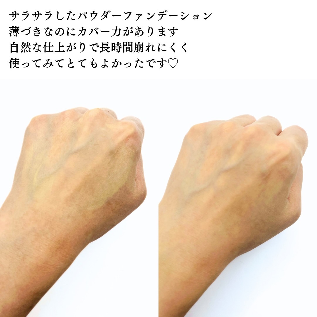 💟パウダーファンデーションなのでサーっと伸ばせて時短 💟薄づきなのにそれなりのカバー力 💟ムラになりにくく、くずれにくい 💟超微粒子パウダーで、仕上がりはサラサラ仕上がりで綺麗です 💟付属のパフも使いやすく、洗ってもへこたれない 【良いところ】1️⃣スキンケア、化粧下地の後はこの商品でベースが終わるので時短です‼️ 2️⃣肌に優しい作りで、肌荒れしていても使えました‼️ 3️⃣鏡、パフ付きでコンパクトなので持ち運びに便利です🎵 ❇️この商品は、肌に優しいので冬に大活躍します😊 ❇️重ねると少しマスクにつきやすいですが、手のひらでなじませるとだいぶ良いです‼️ ❇️しっかりメイクの時はクッションファンデの上にフェイスパウダーかわりに使うと綺麗でサラサラです😳 ❇️クッションファンデ、リキッドファンデも使いますが、肌が揺らいでいるときはパウダーファンデーションが肌負担無く使用できるのでオススメです💕